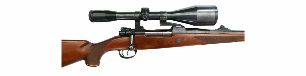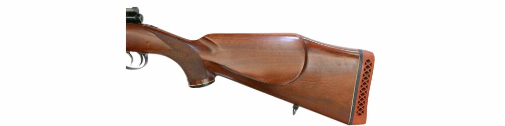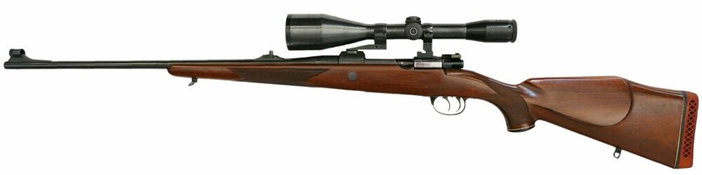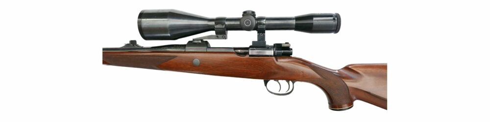 Kettner Repetierbüchse 98er im Kaliber 7x64, montiert mit Schmidt und Bender Klassik 8x56 Abs.4 LP mittels Schwenkmontage, Deutscher Stecher, ventilierte Gummikappe, Deutsche Backe