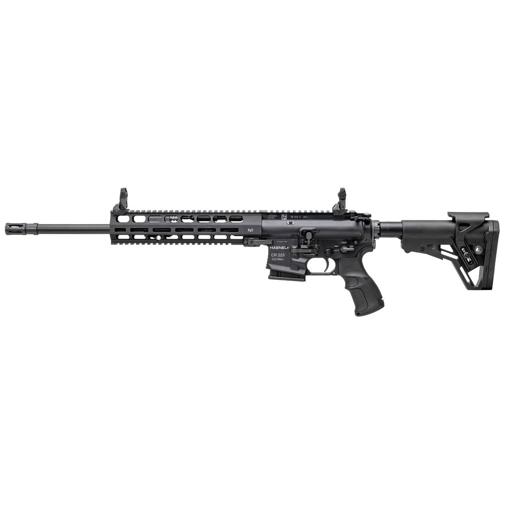 Mit der ?Competition Rifle? 223, kurz CR 223 knüpft die Waffenschmiede Haenel an Ihre lange Tradition in der Fertigung von halbautomatischen Büchsen an. Einst wurde bei C.G. Haenel in Suhl das erste Sturmgewehr der Geschichte gebaut und entwickelt. Es handelt sich bei der CR 223 um eine halbautomatische Büchse mit Pistonsystem im Kaliber .223 Rem. auf Basis des legendären AR 15 Systems. Als moderner Selbstlader in Zentralfeuer-Ausführung, funktioniert auch die Haenel CR 223 als Gasdrucklader mit Drehkopfverschluss. Der Teleskop-Hinterschaft ist in sechs Stufen längenverstellbar. Die Büchse verfügt über einen freischwingenden, kaltgehämmerten Lauf der in drei verschiedenen Lauflängen: 423 mm / 368 mm / 254 mm erhältlich ist. Je nach Lauflänge beträgt die Gesamtlänge zwischen 938 mm und 684 mm. Das Gewicht beträgt je nach Ausführung und Zubehör ca. zwischen 3,35 kg und 3,6 kg. Neben dem Direktabzug mit ca. 3.200 g ist auch ein optionaler Feinabzug erhältlich, dieser löst bei ca. 1.500 g aus. Die Sicherung ist beidseitig bedienbar.