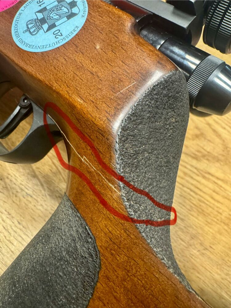 Die Waffe ist in sehr gutem gebrauchtem Zustand. Brünierung ist sehr gut erhalten, die Waffe hat keinen Rost oder technische Defekte. Leider hat der Schaft im Griffbereich einen Riss, welcher auf dem Foto zu erkennen ist. Der Riss ist ausgelemit und stellt bei normaler Nutzung keine Beeinträchtigung dar.