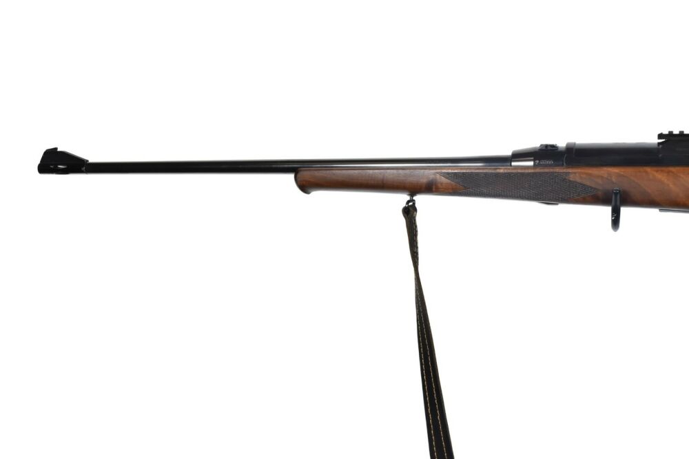 Diese Heckler & Koch 940 im Kaliber .30-06 Springfield ist eine Repetierbüchse mit einer Gesamtlänge von 124 cm, einer Lauflänge von 56 cm und einer Schaftlänge von 40,5 cm. Der Schaft wurde funktional verlängert und mit einer zusätzlichen Schaftbacke versehen. Diese Anpassungen verbessern die Handhabung, stellen jedoch keine optische Aufwertung dar.