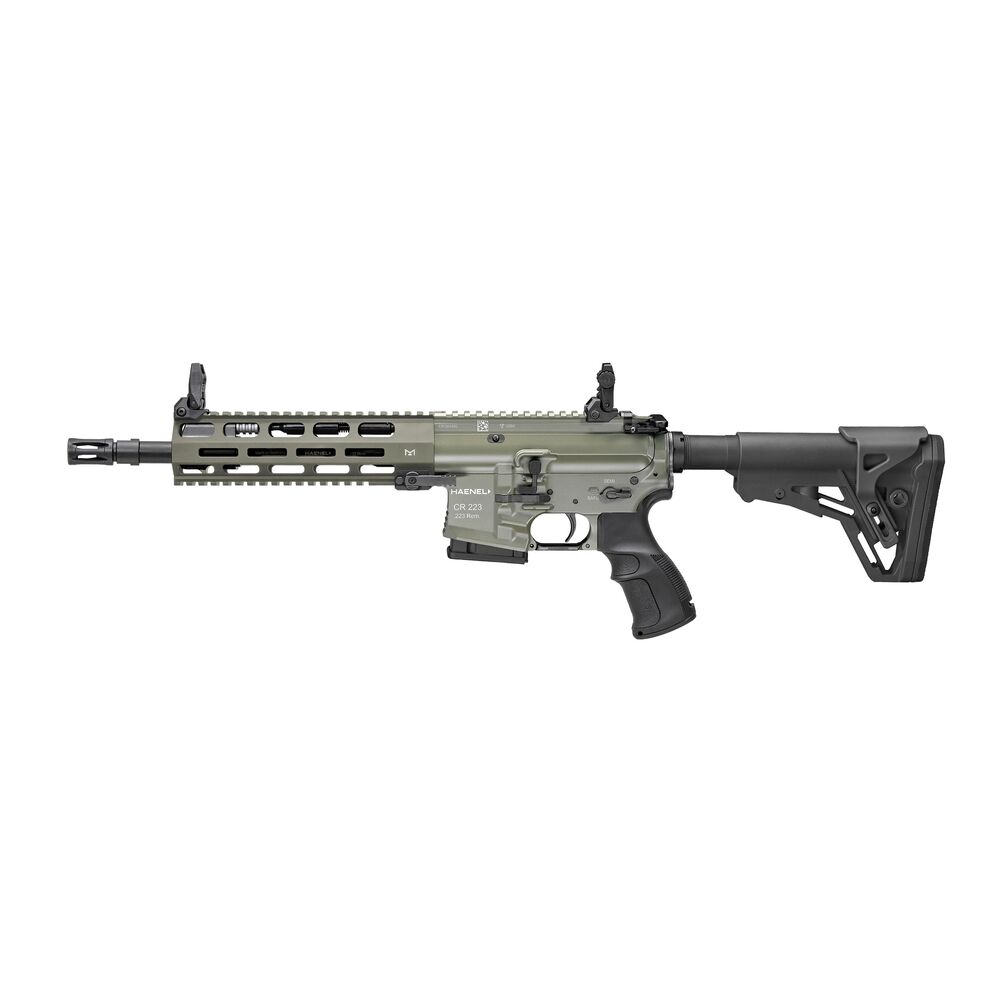 Mit der ?Competition Rifle? 223, kurz CR 223 knüpft die Waffenschmiede Haenel an Ihre lange Tradition in der Fertigung von halbautomatischen Büchsen an. Einst wurde bei C.G. Haenel in Suhl das erste Sturmgewehr der Geschichte gebaut und entwickelt. Es handelt sich bei der CR 223 um eine halbautomatische Büchse mit Pistonsystem im Kaliber .223 Rem. auf Basis des legendären AR 15 Systems. Als moderner Selbstlader in Zentralfeuer-Ausführung, funktioniert auch die Haenel CR 223 als Gasdrucklader mit Drehkopfverschluss. Der Teleskop-Hinterschaft ist in sechs Stufen längenverstellbar. Die Büchse verfügt über einen freischwingenden, kaltgehämmerten Lauf der in drei verschiedenen Lauflängen: 423 mm / 368 mm / 254 mm erhältlich ist. Je nach Lauflänge beträgt die Gesamtlänge zwischen 938 mm und 684 mm. Das Gewicht beträgt je nach Ausführung und Zubehör ca. zwischen 3,35 kg und 3,6 kg. Neben dem Direktabzug mit ca. 3.200 g ist auch ein optionaler Feinabzug erhältlich, dieser löst bei ca. 1.500 g aus. Die Sicherung ist beidseitig bedienbar.