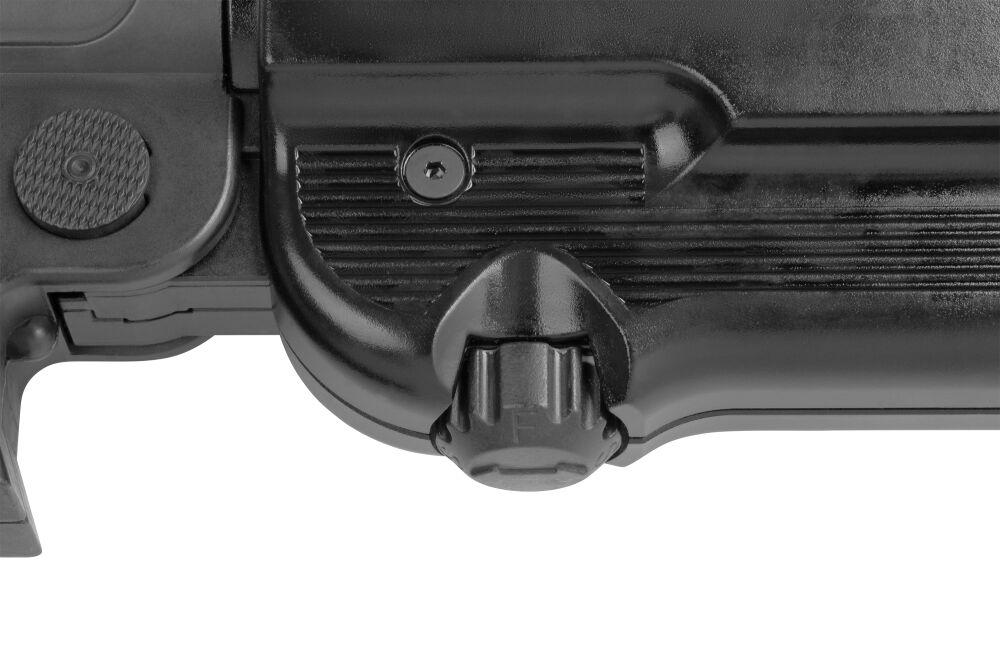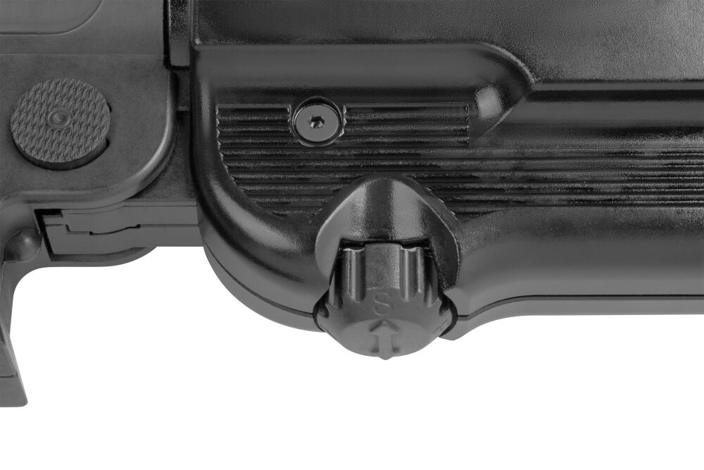 Das Selbstladegewehr im Kaliber .22 besteht aus Stahl und Zinkdruckguss und verfügt über einen Single-Action Abzug und eine klappbare Schulterstütze.