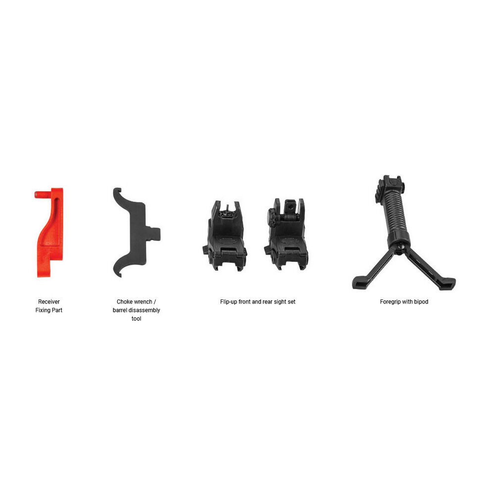 Im oberen Gehäuse ist eine Picatinny Schiene eingearbeitet. Ebenfalls lässt sich der abnehmbare Tragegriff inkl. integrierter verstellbarer Kimme beliebig De- oder Montieren. Ebenfalls verstellbar ist das Korn. Die Flinte ist umbaufähig und beidseitig einsetzbar.