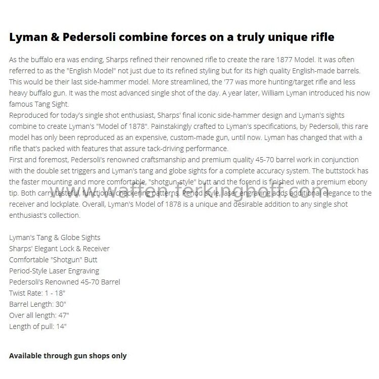 Caliber .45-70Gov, Single Shot Rifle Lyman 1878 Sharps, round match barrel length 30"/76.2cm, peep tang sight/diopter adjustable, double trigger, total length 47"/119.4cm, Custom Shop Pedersoli Italy. Limited quantity - sale as long as available!