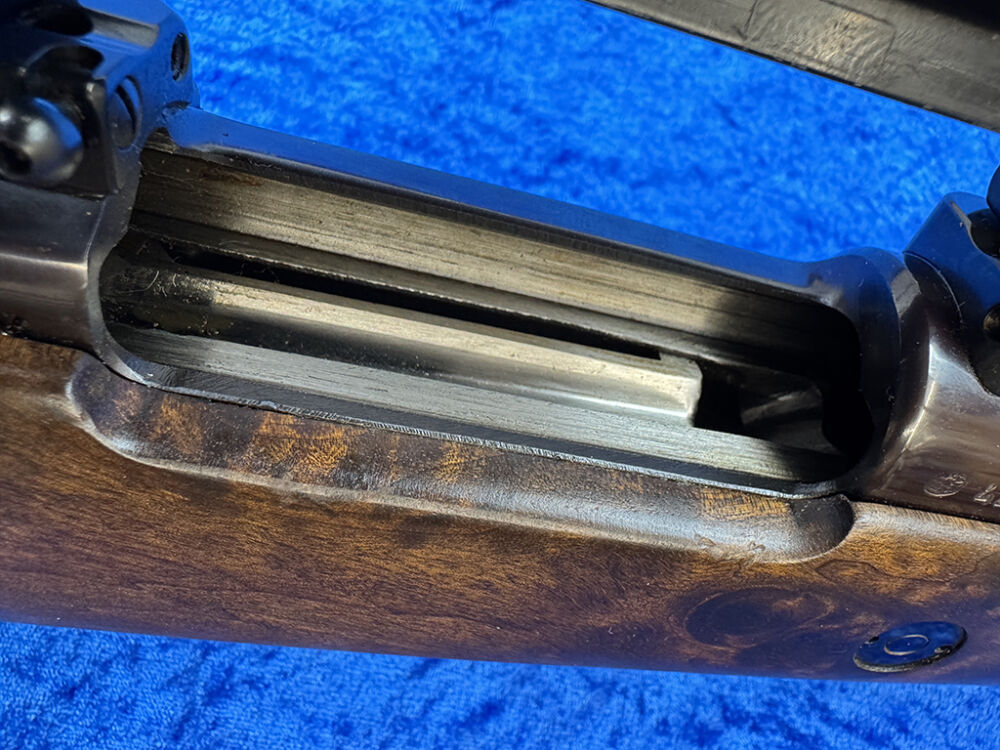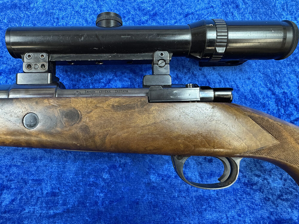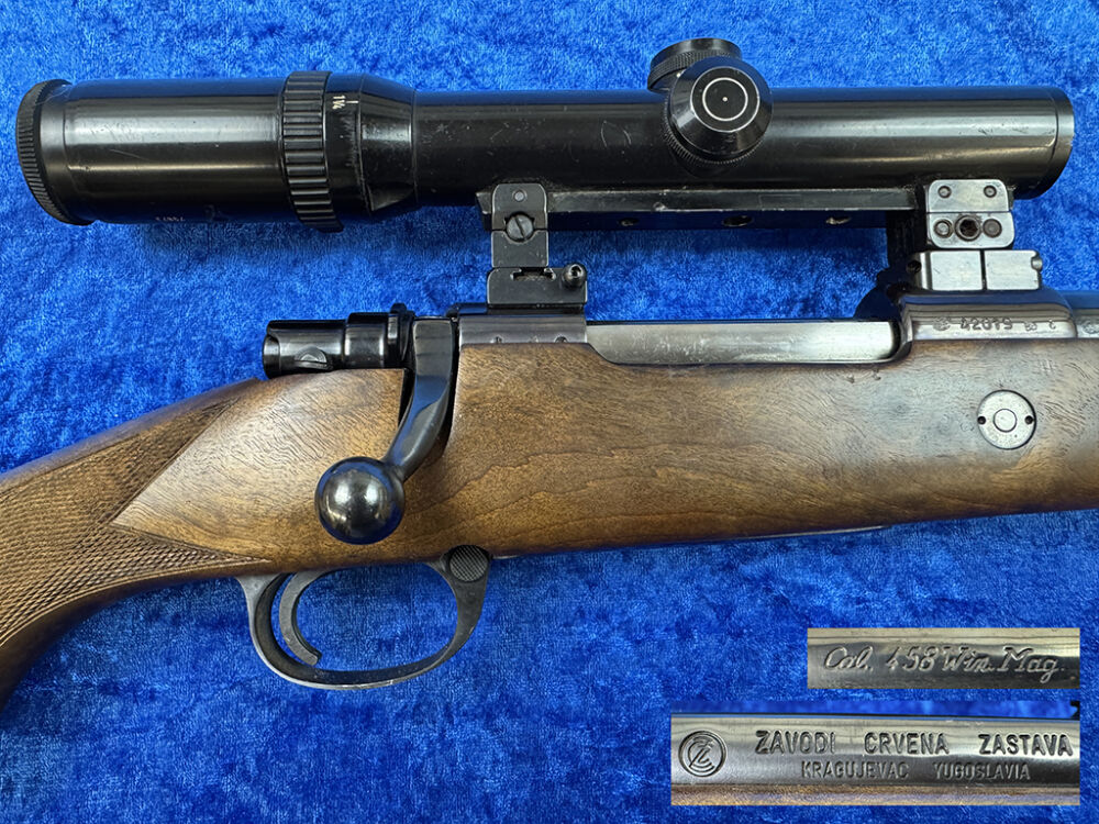 leistungsstarke Repetierbüchse, die auf dem bewährten Mauser-98-System basiert. Sie wurde von Zastava Arms in Serbien produziert und ist für die Großwildjagd konzipiert. Basierend auf dem legendären Mauser 98-System mit kontrollierter Patronenzuführung, was eine hohe Zuverlässigkeit garantiert. Durch den robusten Kastenmagazinverschluss mit massiver Zwei-Warzen-Verriegelung ist das System für diese Patrone ausgelegt. Die Waffe hat einen Luxus-Holz-Jagdschaft mit Pistolengriff und deutscher Backe. Zusätzlich ist der Lauf über eine Querstollenverschraubung mit dem Schaft verbunden. Das Drückjagd-Glas, Schmidt & Bender 1,25 - 4 x 20 Absehen 1, ist mit einer EAW Schwenkmontage befestigt. Dadurch kann es sehr schnell abgenommen werden und über die Drückjagdvisierung gezielt werden. Die Waffe wurde in Jugoslawien beschossen.