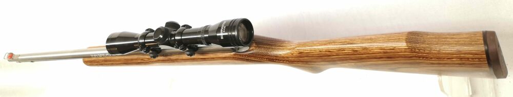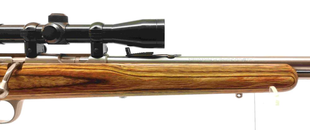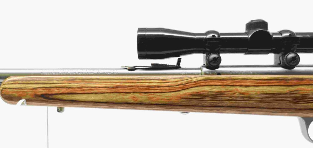 N3713 Marlin - 883 SS - Note 2 - MARLIN 883 SS Einzelladerbüchse (Umbau von Büma von Mehrlader auf Einzellader), stainless Lauf, Groove Barrel, Kaliber .22 Magnum (.22 WMR), Röhrenmagazin (prof. gesperrt), Schiebekimme, orangefarbenes Korn mit Kornschutz, installiertes Zielfernrohr von BUSHMASTER, 4x32 unbeleuchtet, Röhrenmagazin und Abzugsbügel sowie Abzug in silberfarben, schöner Schichtholzschaft m. Gummischaftkappe, Aufnahmen f. Riembügelösen, optisch und technisch Note 1,5 *** EWB-pflichtig ***