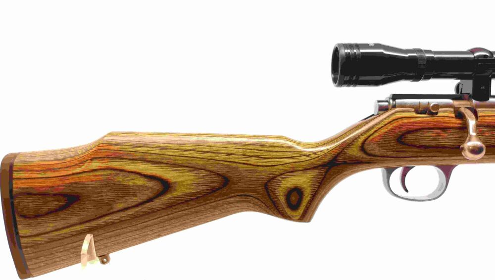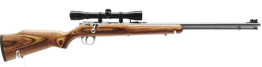 Besonderheit: MARLIN 883 SS Einzelladerbüchse (Umbau von Büma von Mehrlader auf Einzellader), stainless Lauf, Groove Barrel, Kaliber .22 Magnum (.22 WMR), Röhrenmagazin (prof. gesperrt), Schiebekimme, orangefarbenes Korn mit Kornschutz, installiertes Zielfernrohr von BUSHMASTER, 4x32 unbeleuchtet, Röhrenmagazin und Abzugsbügel sowie Abzug in silberfarben, schöner Schichtholzschaft m. Gummischaftkappe, Aufnahmen f. Riembügelösen, optisch und technisch Note 1,5