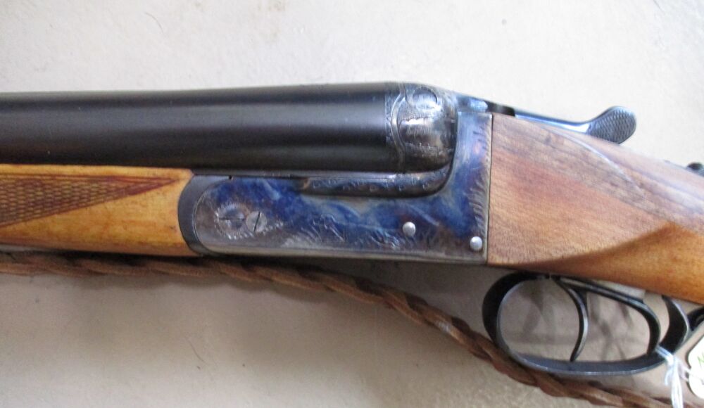 Doppelflinte 16/70, El Fasain, Spanien, Läufe blank, kein Stahlbeschuss, Lauflänge 70cm, Schaftlänge 76,5 cm, Gesamtlänge 114cm. Systemkasten bunt marmoriert.