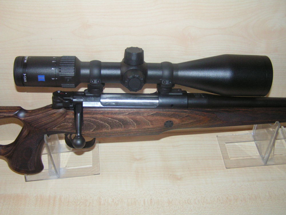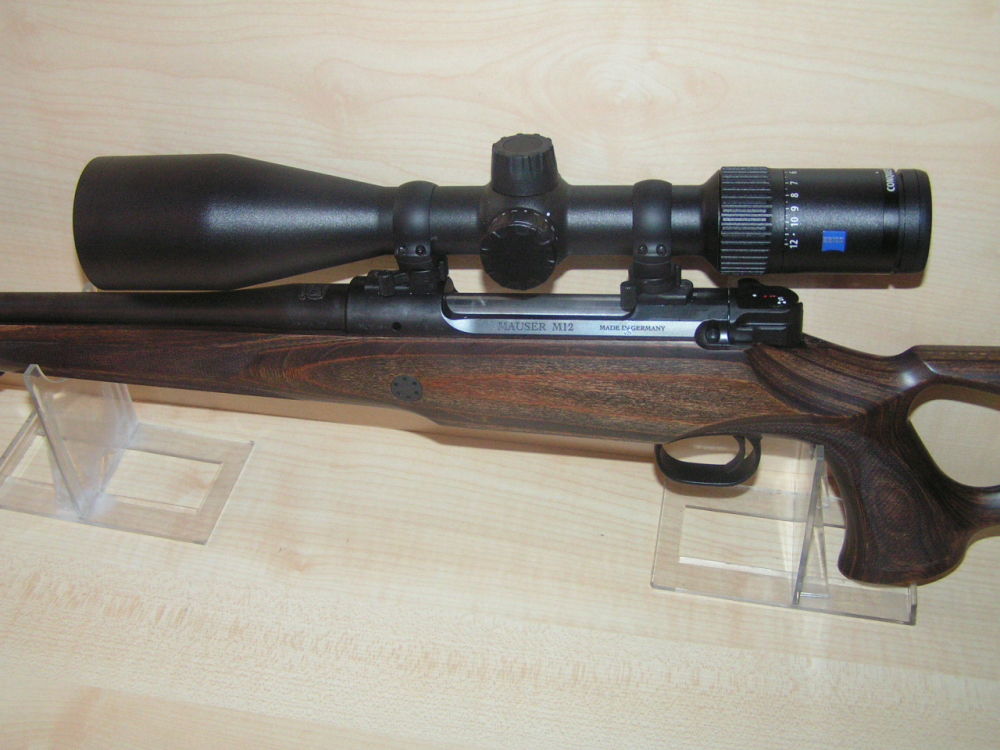 Repetierbüchse Mauser 12 Max im Kaliber 308 Win. mit Schichtholzschaft, 47 cm Lauflänge mit Mündungsgewinde, Handspannung, Schaftrückenverstellung, Weaver - Montage und Zielfernrohr Zeiss Conquest V4, 3 - 12 x 56 Leuchtabsehen 60.