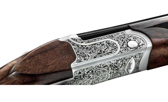 • Ausstattung: Hartverchromte Läufe von innen und außen. Stahlbasküle mit gelaserter Arabeskengravur. Messing-Korn.
