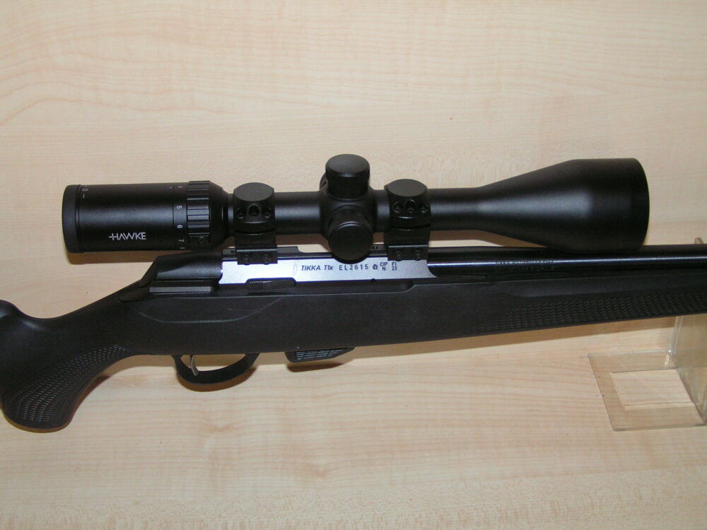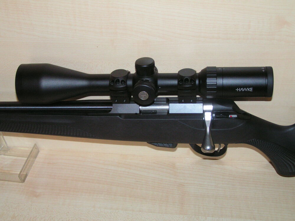 Linkssystem - Repetierbüchse Tikka, Modell T1x im Kaliber 17 HMR mit 51 cm Lauflänge mit Mündungsgewinde, 10 Schuß Magazin, Aufschubmontage und Zielfernrohr Hawke, Vantage, 4 - 12 x 50 Leuchtabsehen 4. Mehrpreis für Schalldämpfer.