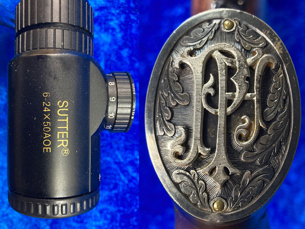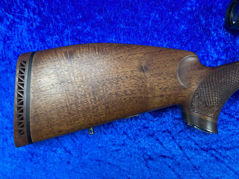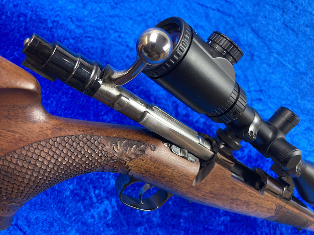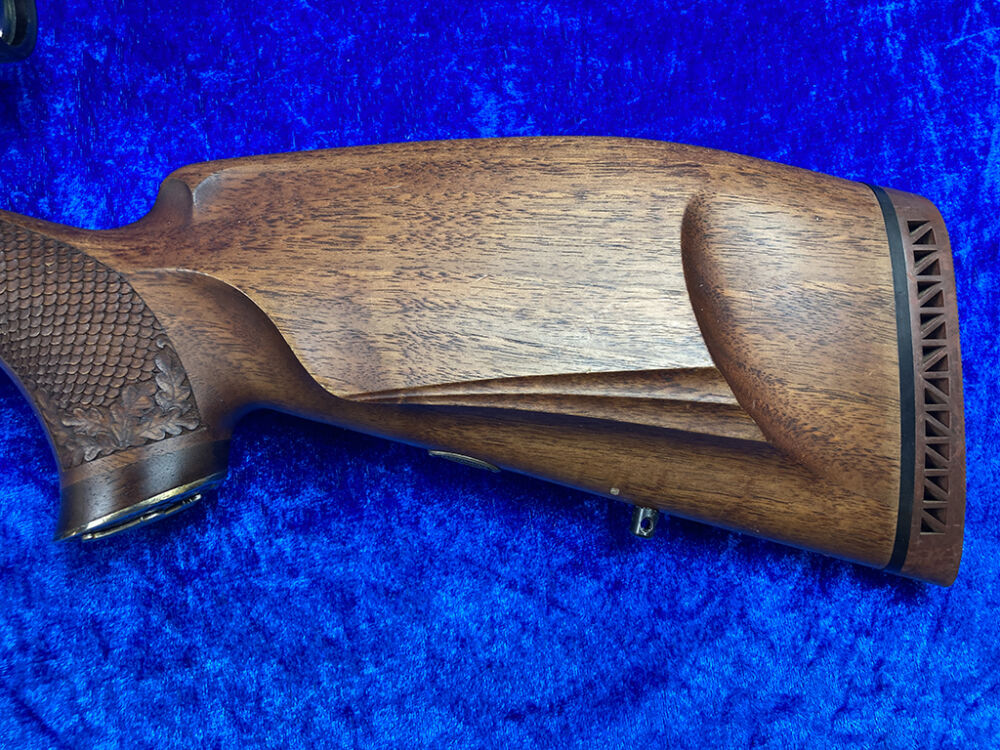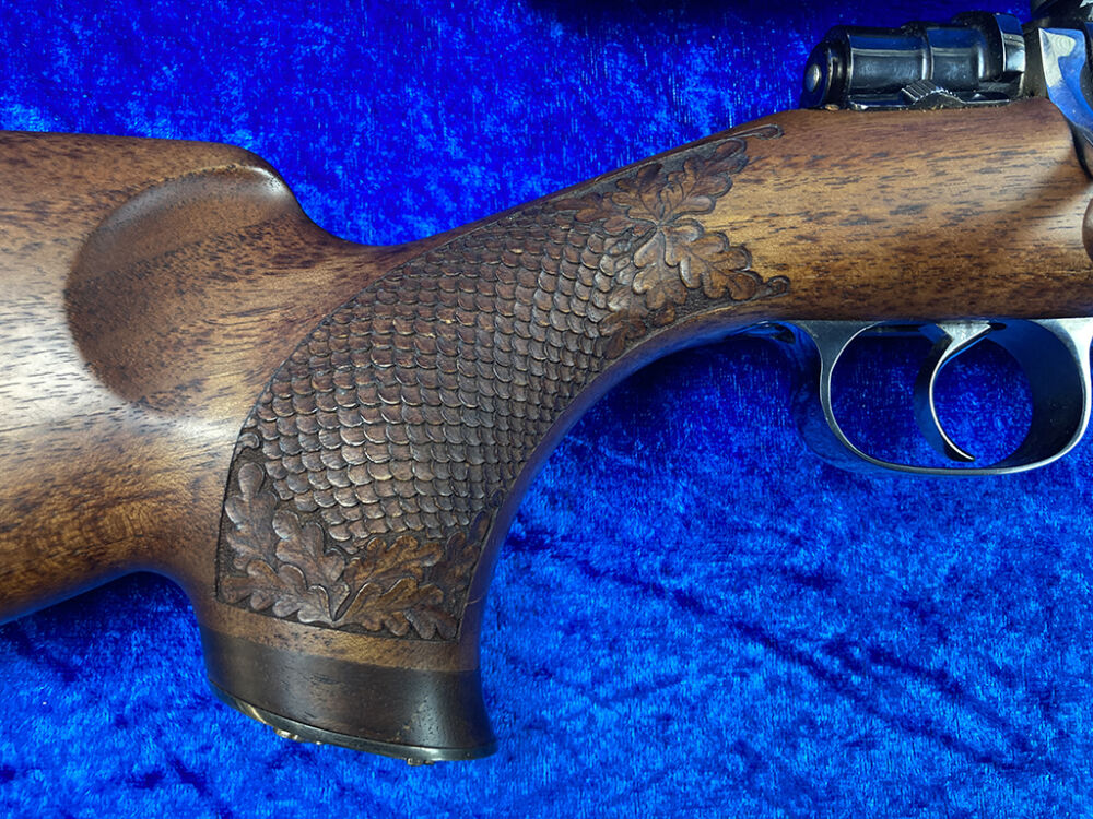 Dieser schwedische Repetierer kommt aus dem Nachlaß eines Jägers. Die Waffe hat einen geölten Nußbaumschaft mit schöner Fischhaut und Eichenlaub. Es sind Schaftverschneidungen vorhanden und der Griff schließt mit einer edlen Kappe. Ein Sutter Zielfernrohr 6 – 24 x 50 und Absehen 4 fein ist mit einer Schwenkmontage befestigt. Diese Waffe wurde von einem ungarischen Büchsenmacher aus Kaposvar veredelt. Die Waffe wurde im März 1966 in Ulm beschossen.