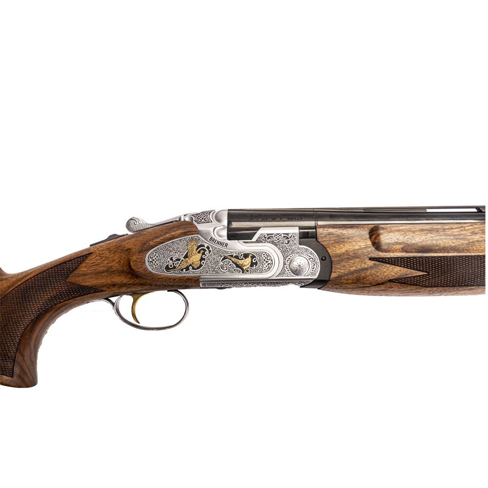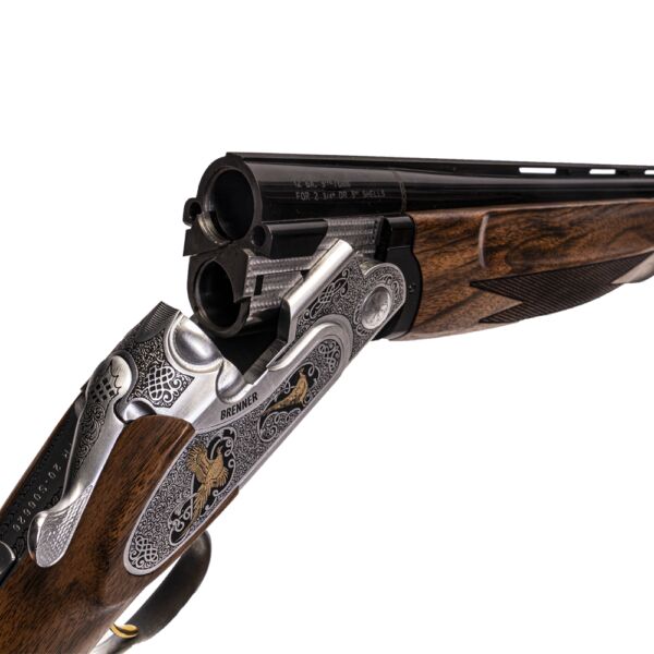 Die Premium Bockflinte von Brenner, deren Schaft aus exklusiven Walnuss-Schaftholz gefertigt wird, ist die ideale Waffe für Jäger und