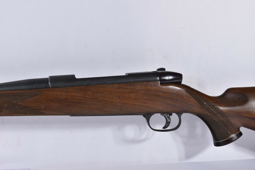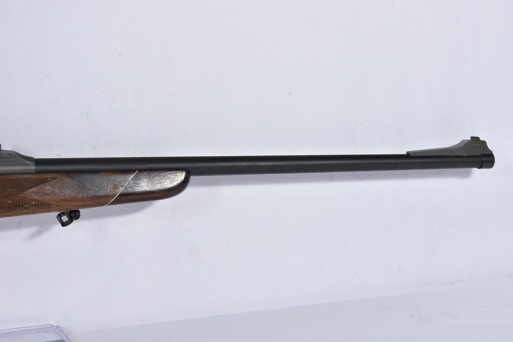 Die Sauer Weatherby Mark V 7x64 Repetierbüchse hat eine Gesamtlänge von 113 cm und eine Lauflänge von 60 cm. Die Schaftlänge beträgt 35 cm und das Gewicht 3,5 kg. Der Zustand der Waffe ist 2-3, was normale bis mittelstarke Gebrauchsspuren bedeutet. Der Schaft besteht aus Holz mit Abschluss. Sie hat eine Magazinkapazität von 5 und verfügt über zwei Riemenbügel. Ein gültiger Beschuss ist unten am System vorhanden.