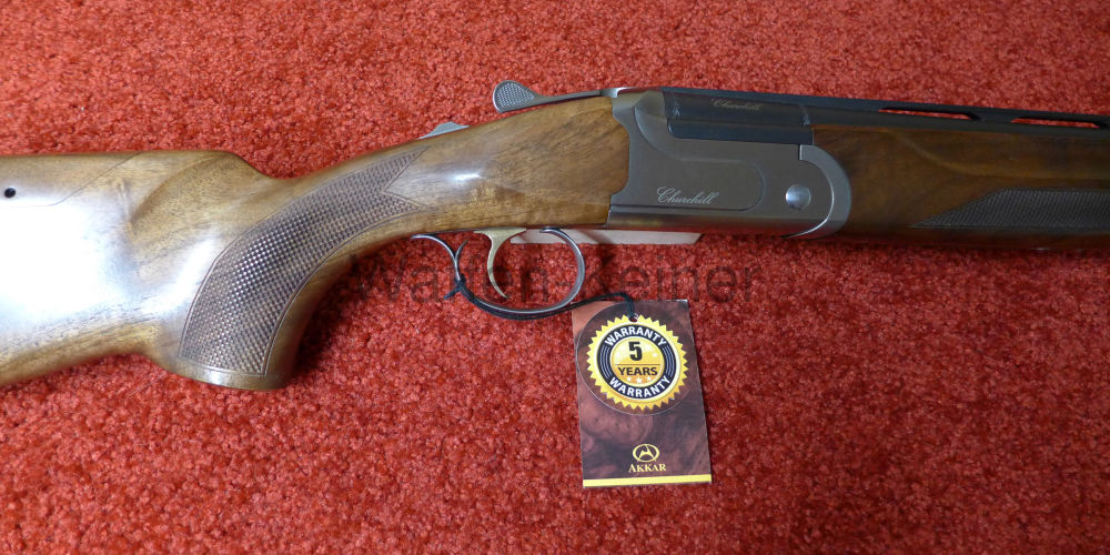 Bockdoppelflinte AKKAR Churchill 206E Parcour mit geöltem Nußbaumschaft mit höhenverstellbarer Wangenauflage, Ejektoren, 6 Wechselchokes von Zylinder bis Vollchoke, Lauflänge 71 cm, Gewicht 3,3 kg, umschaltbarer Einabzug, Systemkasten aus Stahl, Stahlschrotbeschuß, 5 Jahre Garantie, Schaftlängen zwischen 36 und 38 cm durch Schaftkappen nach Wunsch, rotes Fiberkorn
