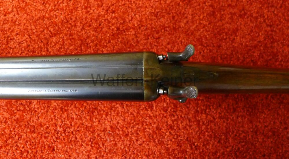 Traditionelle schwedische Doppelflinte mit Lefaucheux-Verschluß, Zentralfeuerzündung, Seitenschlossen, englischer Schaft aus geöltem Nußbaumholz, alle Stahlbeschläge buntgehärtet und die Läufe schwarz brüniert, ursprüngliches Kaliber 16/65, vermutlich wurde das Patronenlager auf 70 mm aufgerieben, denn die Flinte trägt einen deutschen Beschuß, Hannover 1992 mit dem Kaliber 16/70. Das Modell 20 wurde von 1890 bis 1946 hergestellt.