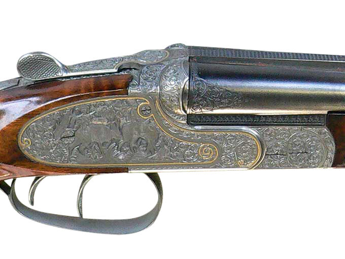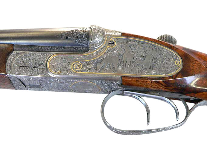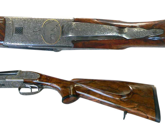Extrem engangelegten Laufbündel im Kaliber 8x57 IRS mit langen Seitenplatten, hochfeinem Wurzelmaserholz mit Reliefgravur goldumrandet. Kaliber 8x57 IRS mit zwei Wechselläufen.