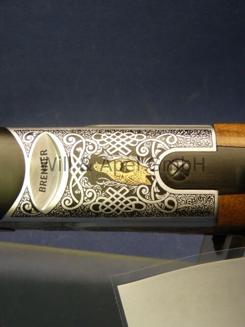 BRENNER Bockdoppelflinte Modell BF20 Ausführung GOLD Kaliber 12/76 Lange Baskül Seitenpaltten mit Gold touchierte Tierstücke Lauflänge Wechselchokes Stahlschrotbeschuss Einabzug ... ...weiterlesen