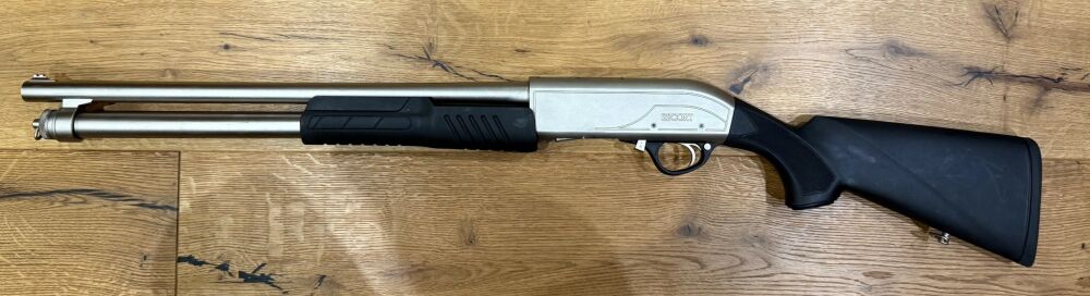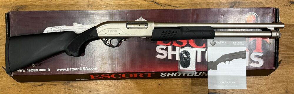 Die Escort MarineGuard ist eine Vorderschaftrepetierflinte mit einem 20“ (51 cm) Lauf inkl. Fiberkornglas und eingebautem Zylinderchoke zum Verschießen von Schrotpatronen oder Slugs im Kaliber 12/76.