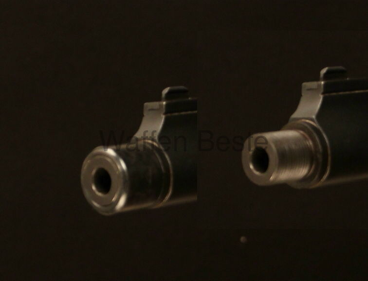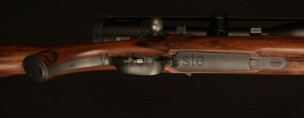 Abzug trocken und leichtgängig ca. 750g (Handarbeit sehr feines hintenliegendes Züngel), verlängerte Scheibe und Abzugbügel, Dreistellungssicherung, Mündungsgewinde mit Mutter, Riemenbügelring über Lauf verlötet, 2 Klappen Expressvisier, Kornsattel mit Ring, Stahl Pistolengriffkappe, Klappdeckel Magazinkasten mit spez. Druckknopf von Hand zu öffnen,
