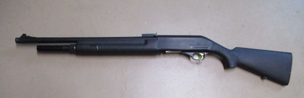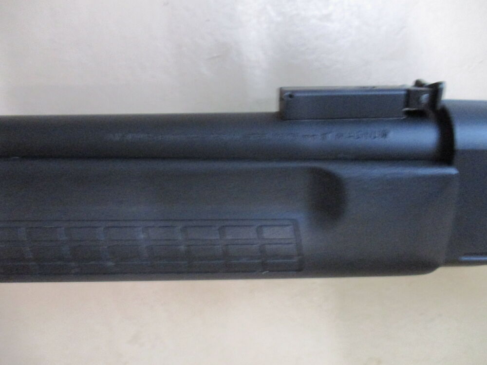 Neuwertige nur beim Beschuß geschossene Selbstladeflinte 12/76 mit Kunststoffschaft. Verstellbare Visierung. Es fehlt die Abdeckung des Mündungsgewindes.