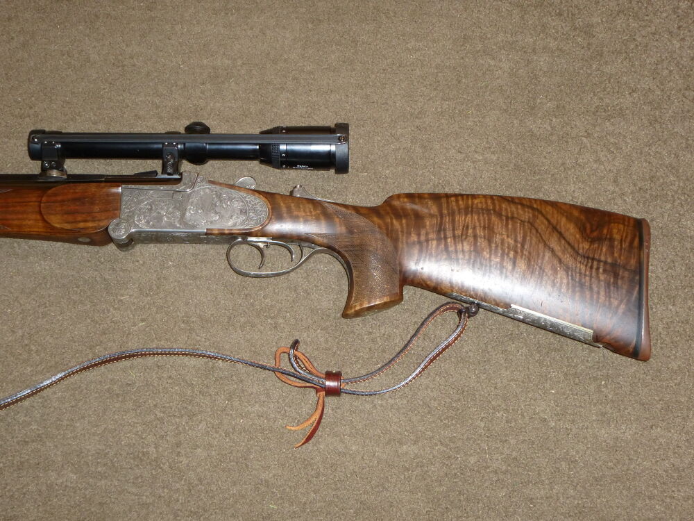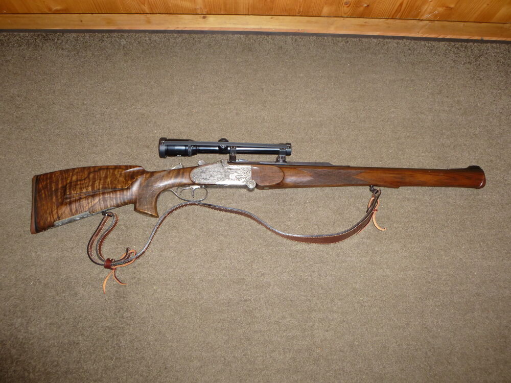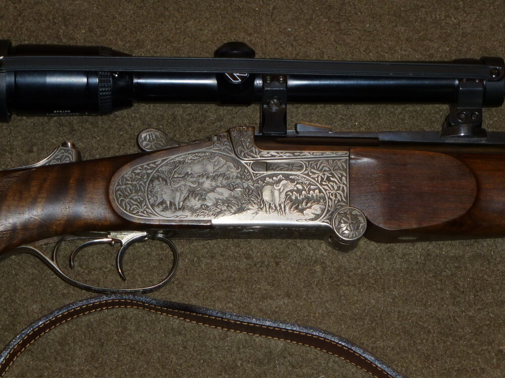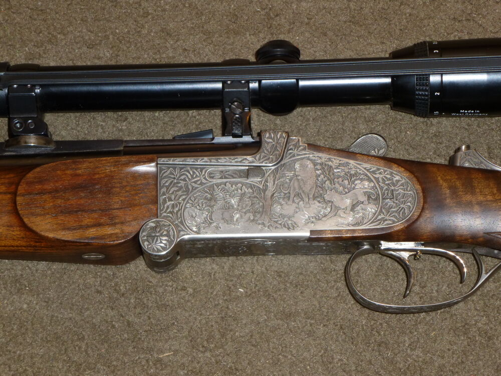 gebrauchte Bockdoppelbüchse Otto Baier Linden, Mod. KS 88, linksgeschäftet, Kal. .416 Rigby, Einstecklauf Kal. 6x70R, Lauflänge 62 cm, Schaftlänge 36 cm, Handspannung, Rückstecher in beiden Abzügen, S... ...weiterlesen