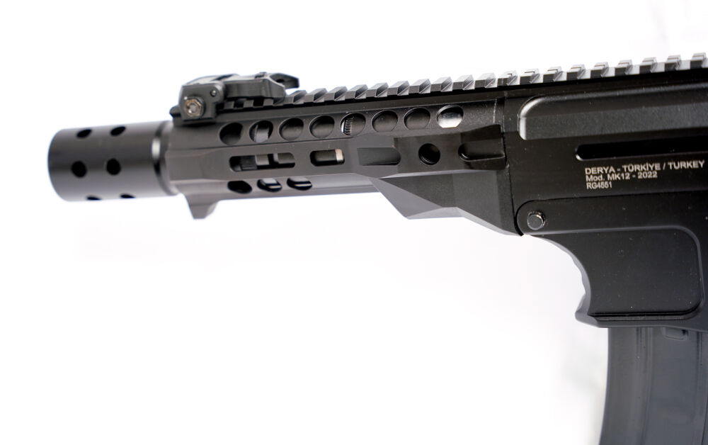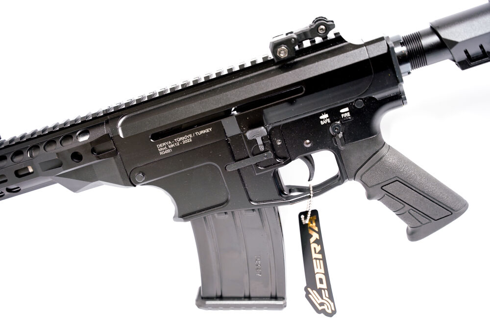 Die leistungsfähige und vielseitige MK-12 ist eine gasbetriebene halbautomatische Flinte mit zweiteiliger Gehäusekonstruktion aus hochwertigem 7075 Aluminium. Die Sicherung, der Verschlussfang und Magazinauslöser entsprechen in ihrer Funtion dem AR15. Am Verschlussgehäuse wurde Picatinny-Schiene angebracht, die die Montage von optional erhältlichem Zubehör erlauben. Standardmäßig ist die MK-12 mit einer verstellbaren offenen Visierung ausgestattet, die beide verstellt werden können. Der Teleskop-Hinterschaft, sowie die Wangenauflage sind individuell einstellbar. Die integrierte, weiche Schaftkappe mindert den Rückstoß. Zum Lieferumfang gehören neben den drei abnehmbaren (2+1, 5+1, 10+1) Kastenmagazinen, eine Ledertasche, Wechselchokes und der Zerlegewerkzeug.