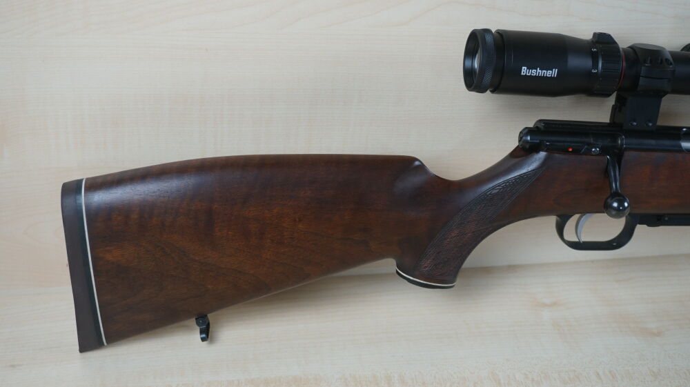 Repetierbüchse Weihrauch, Modell HW 60 J im Kaliber 222 Rem. mit Druckpunktabzug, 3 Schuß Magazin, Visierung, Aufschubmontage und Zielfernrohr Bushnell Nitro 3 - 18 x 56 Leuchtabsehen 4.