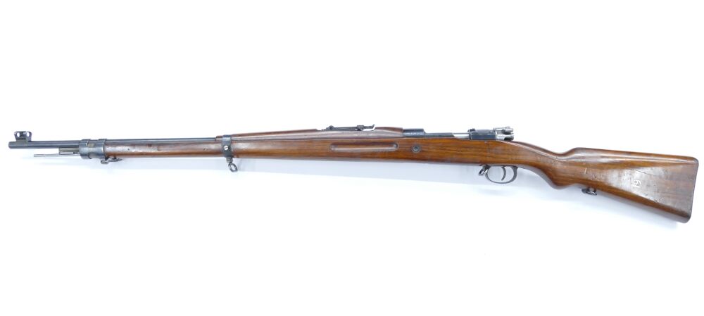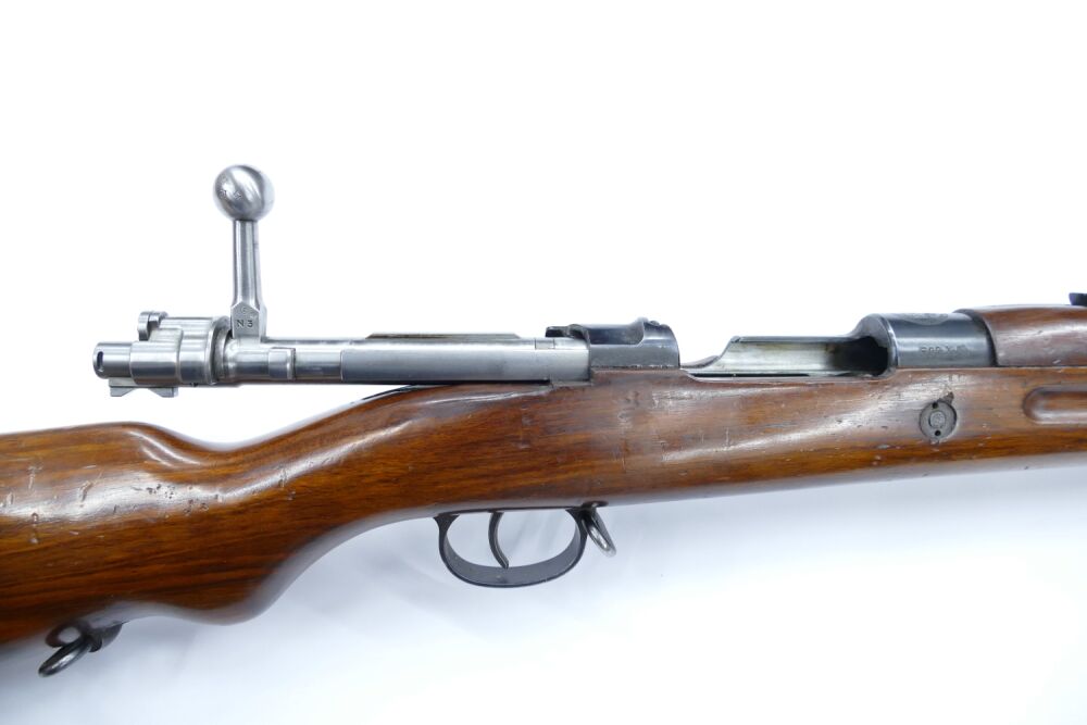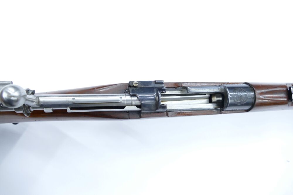 Mauser M38, Standardgewehr des Irans ab 1938. Lauf innen spiegelblank, Felder und Züge scharf.  Auf originalen Mauser-Maschinen von den Brünner Waffenfabriken hergestellt. Beschriftungen in Farsi „Langes Gewehr M 1317“ (1317 ist die Muslimische Jahreszahl = Mod. 1938).  Auf dem Hülsenkopf ist das persische Hoheitszeichen aufgestempelt. Seriennummer und alle Beschriftungen in Farsi. Guter Zustand, sehr schöne Sammlerwaffe. Nummerngleich.