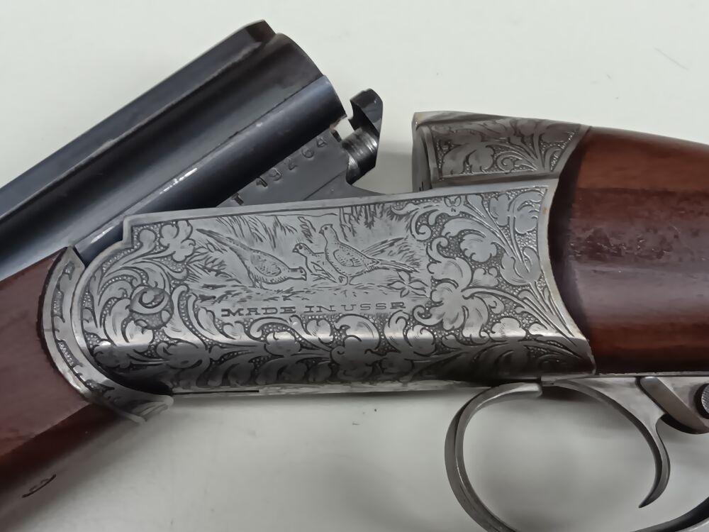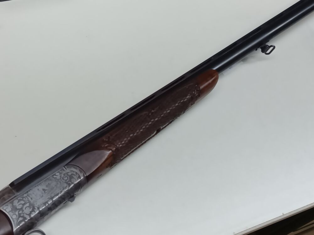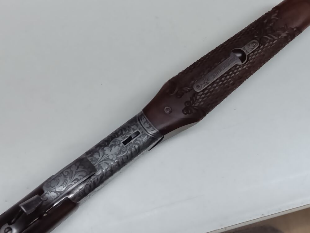 Einschüßige Kipplaufflinte in Luxusausführung aus dem Baikal-Customcenter , Hochwertige Verarbeitung , Einzelstück , ausgesuchtes Maserholz mit handgeschnittener Fischhaut und Ranken , der Stahlsystemkasten ist mit Tierstücken und Floralornamenten graviert , das System ist absolut Dicht , Spannanzeige auf dem Kolbenrücken , Druckknopfsicherung hinter dem Abzug , 14 mm breite ventilierte Laufschiene , weißes Kunststoff-Perlkorn , Flintenabzug , vollständige und makellose originale Laufbrünierung , der 72,5 cm lange dickwandige Lauf ist innen spiegelblank , Gesamtlänge 114 cm , Schaftmass 37 cm , ventilierte Gummischaftkappe , komplett nummerngleich , Deutscher Beschuß vom Februar 1973