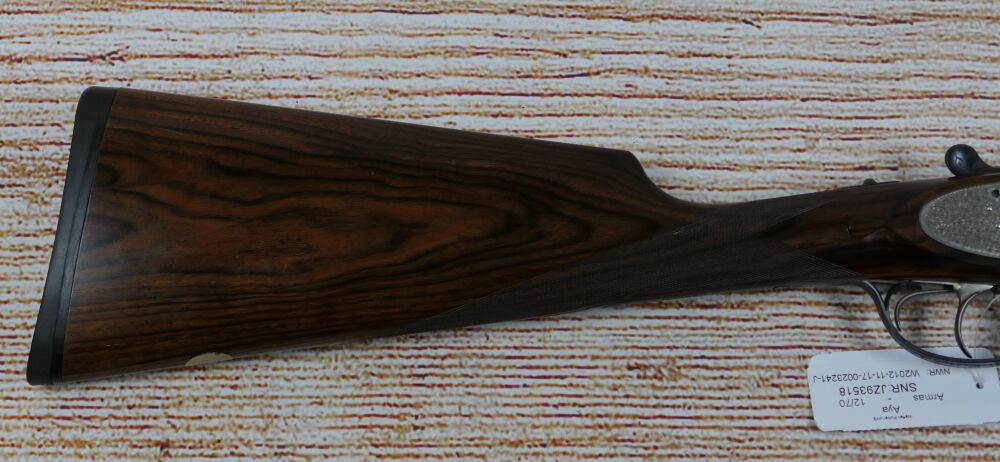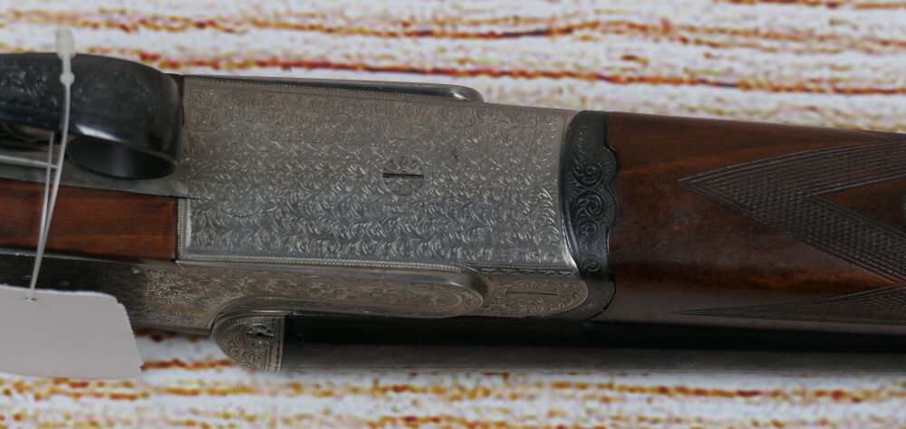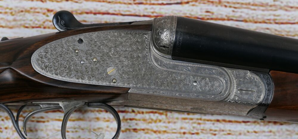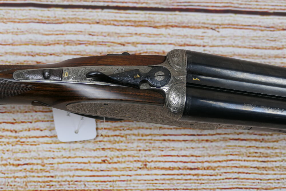 Echte herausnehmbare Seitenschlosse mit Arabeskengravur, gutes Schaftholz, Gelenkabzug, Spannungsanzeige, Purdy Nase,