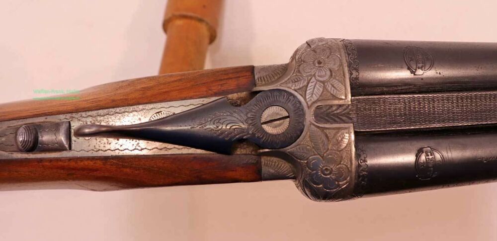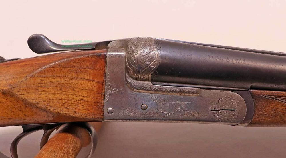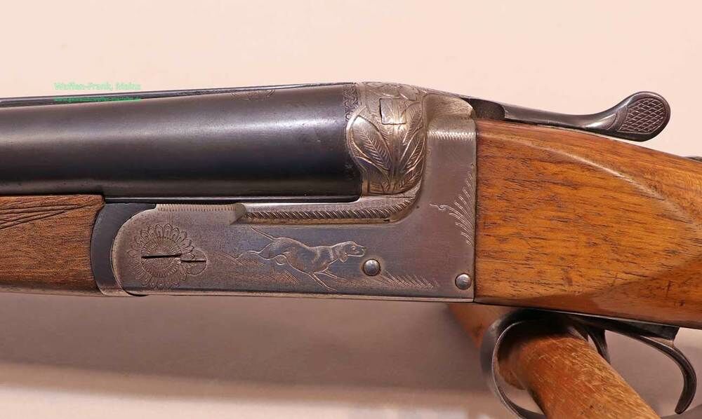 Ansonsschloß mit Doppelabzug und automatischer Sicherung, Choke 1/2-1/1, Handgravur auf vernickeltem Stahlsystemkasten, klassische Schäftung mit deutscher Backe für Rechtsschützen, Schaftlänge 355mm, sichtbare Gebrauchsspuren an Holz- und Metallteilen.....Einzelstück EUR 149,-