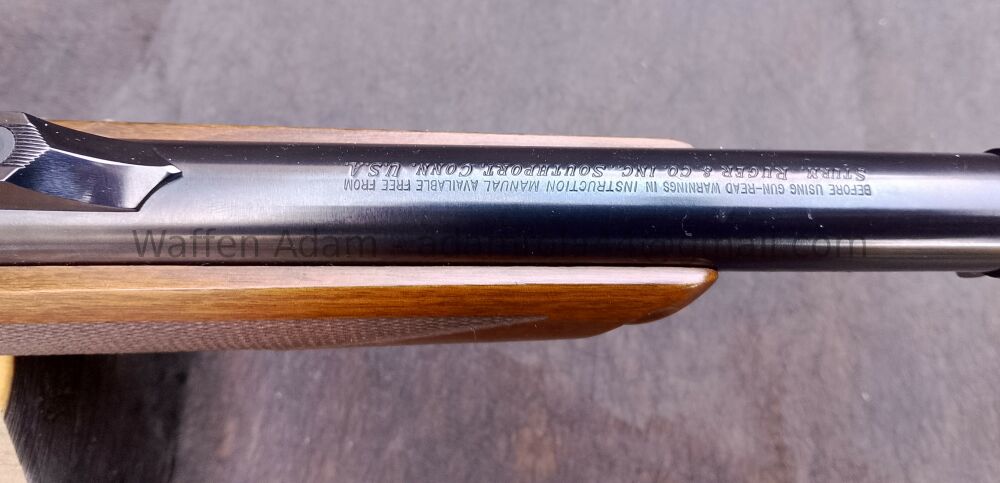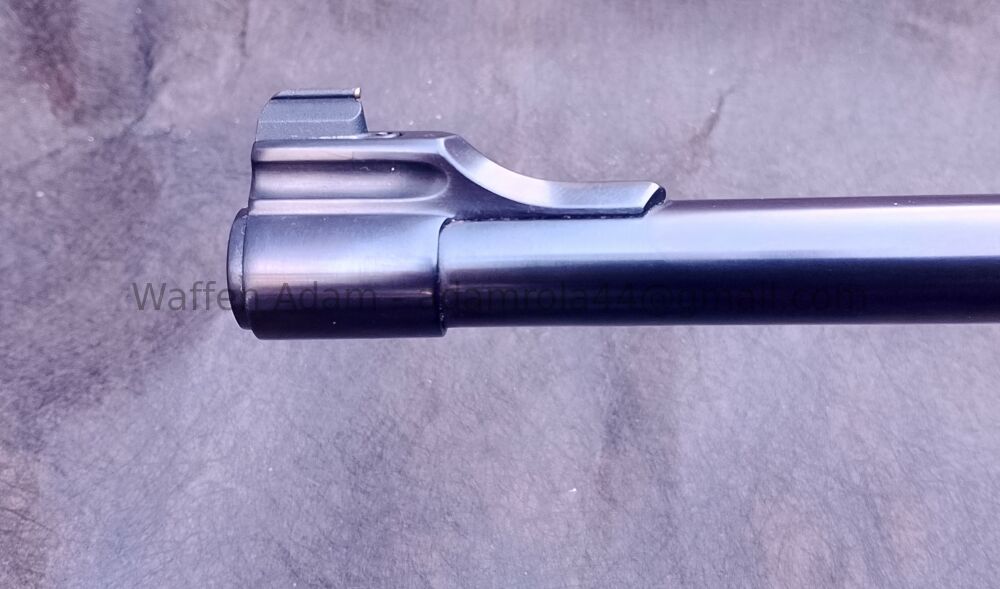 Blanker, an der Mündung verstärkter Lauf . Perl-Korn auf gefluteter Rampe , Klappvisier. Guilochierte Ruger Laufschiene mit Vorbereitung zur problemlosen ZF Montage.