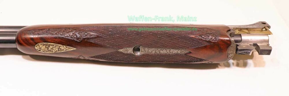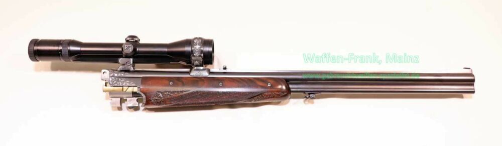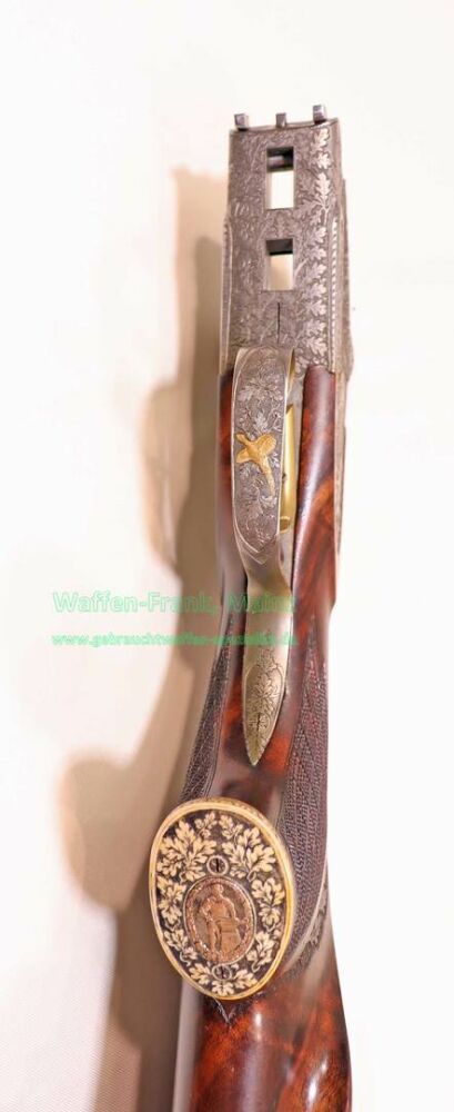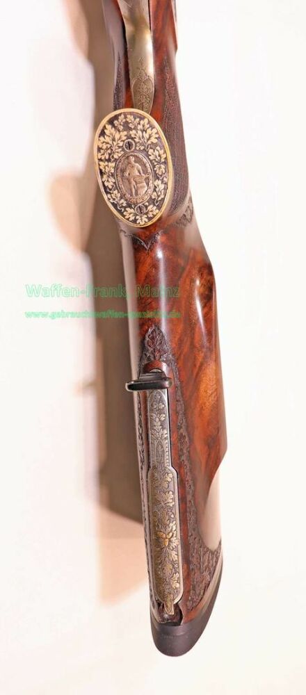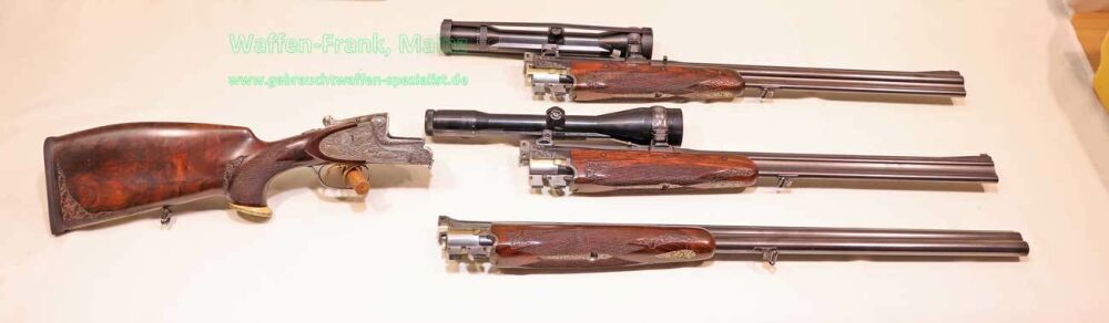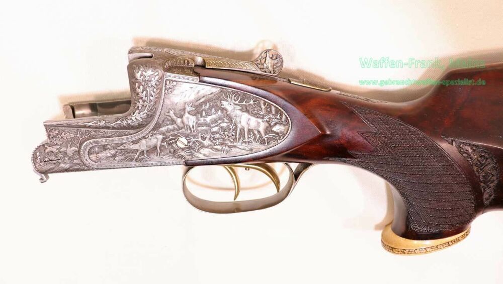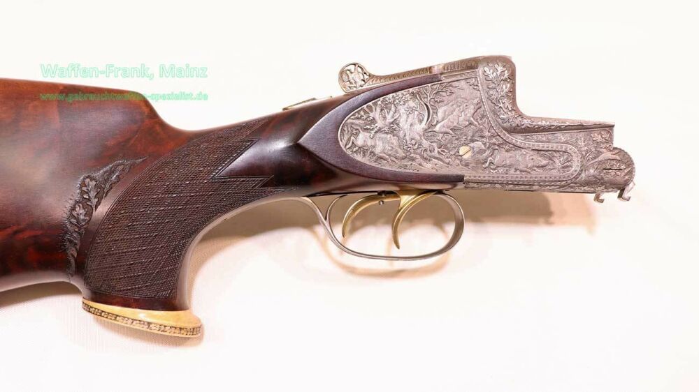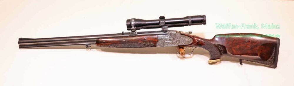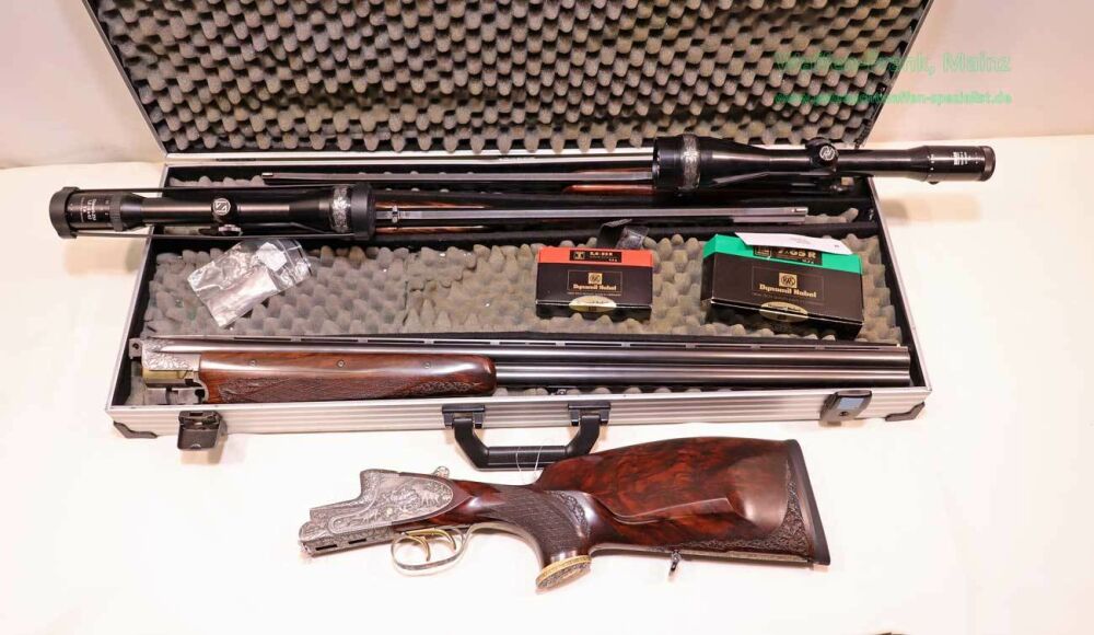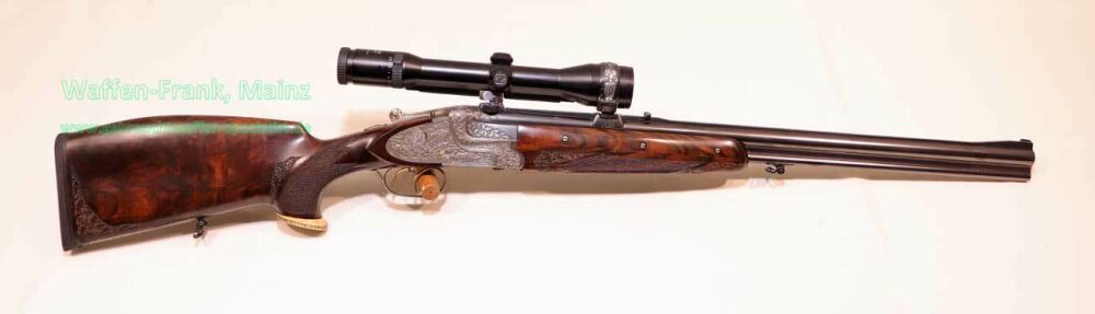 aus Sammlungsauflösung, jagdlich nicht geführt, als reines Unikat gefertigt durch die Büchsenmacherei J. Keiner, Haidersbach im Auftrag der Büchsenmacherhandelsgenossenschaft, als Staatspräsent der DDR für ihren mehrfachen Europameister und Olympia Silbermedaillen Gewinner 1980 und 1988 in der Disziplin laufende Scheibe, sowie mehrfacher Träger des vaterländischen Verdienstorden der DDR, sowie anschl. Bundestrainer, die Bauteile, wie Lauf und System sind baugleich wie bei Merkel Mod. 303/324, mit herausnehmbarem Seitenschloß mit Signalwelle, doppelter Laufhaken- und Kerstenverschluss, beide Abzüge mit Rückstechereinrichtung, hochwertige und tief gestochene Jagdstückgravur, rechts Sauenhatz, links Hirschbrunft, Muschel mit tiefgestochenem und modelliertem Eichenlaub, aufsteigender Fasan auf Abzugsbügel in Gold eingelegt, durchbrochener Verschlusshebel als balzender Auerhahn, Pistolengriffkäppchen aus Bein mit eingelegtem Suhler Büchsenmachermotiv, graviertes Schaftmagazin, ebenfalls passende Gravur auf allen Laufwurzeln und Zielfernrohrmontageringen, (ingeputzter Ausführung), Schaft aus hochwertigem Wurzelmaserholz auf Wunsch und Maß des erstbesitzers gefertigt, Holzklasse 7-8, bei allen drei Laufpaaren seperater, geteilter Vorderschaft mit gravierter Beineinlage, feinste handgeschnittene, schottische Fischhaut, mit Eichenlaubeinrahmung, BBF-Wechsellauf 12/70-7x65R mit ZF Zeiss Diavari-ZM 1,5-6x42 Absehen , Bergstutzen-Wechsellauf 5,6x52R-7x65R mit ZF Zeiss Diavari-Z 2,5-10x52 Absehen 4 (war bereits schoneinmal montiert), jagdlich brauchbares Zusammenschießen mit RWS TM 4,6g/10,5TIG, von 1986, Doppelflintenlauf 12/70, Choke 1/2-1/1, mit Ejektor, im abschließbarem Luftreisekoffer, aktueller Vergleichspreis EUR 67.824,- bei Neukauf mit mindestens zwei Jahren Lieferzeit und voraussichtlich nicht mehr in dieser hochwertigen, meisterlichen, Spitzenqualität!..Preis auf Anfrage