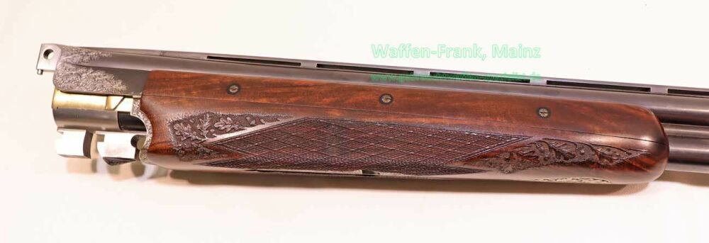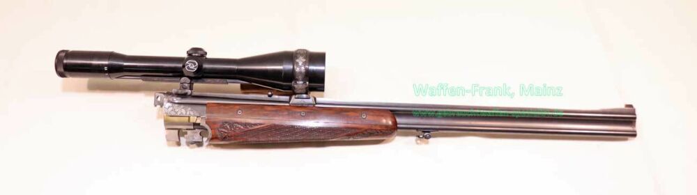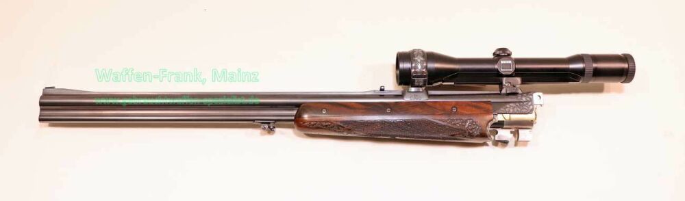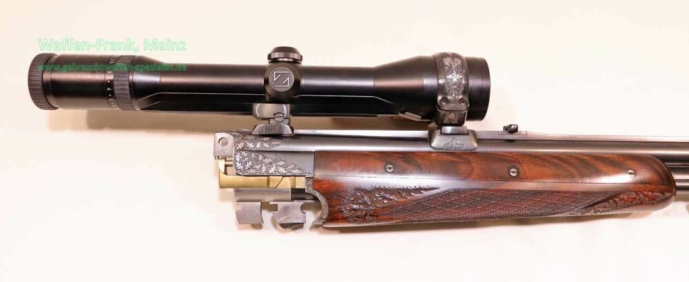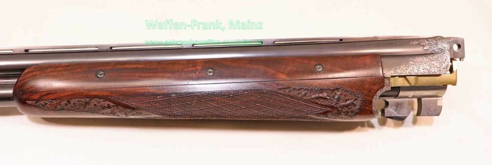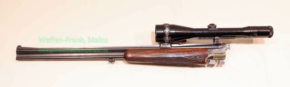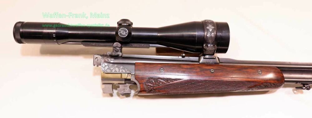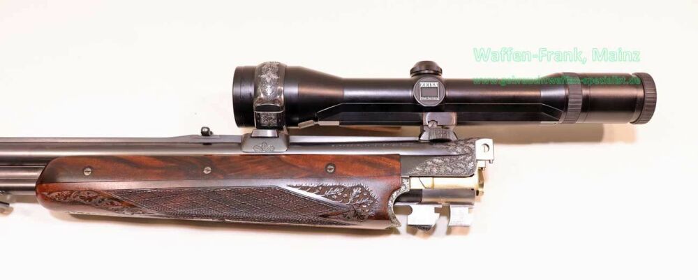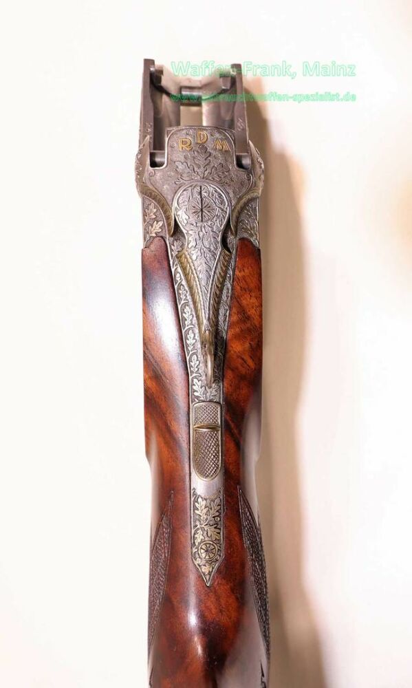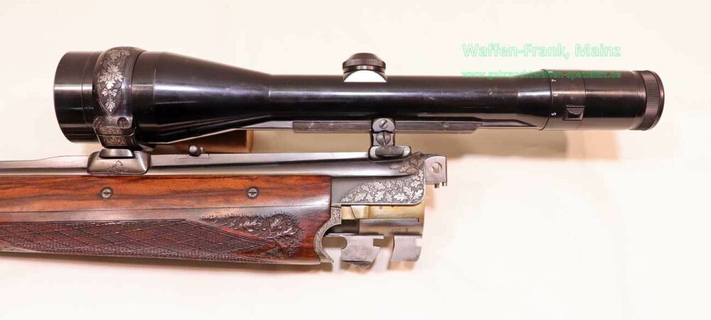 aus Sammlungsauflösung, jagdlich nicht geführt, als reines Unikat gefertigt durch die Büchsenmacherei J. Keiner, Haidersbach im Auftrag der Büchsenmacherhandelsgenossenschaft, als Staatspräsent der DDR für ihren mehrfachen Europameister und Olympia Silbermedaillen Gewinner 1980 und 1988 in der Disziplin laufende Scheibe, sowie mehrfacher Träger des vaterländischen Verdienstorden der DDR, sowie anschl. Bundestrainer, die Bauteile, wie Lauf und System sind baugleich wie bei Merkel Mod. 303/324, mit herausnehmbarem Seitenschloß mit Signalwelle, doppelter Laufhaken- und Kerstenverschluss, beide Abzüge mit Rückstechereinrichtung, hochwertige und tief gestochene Jagdstückgravur, rechts Sauenhatz, links Hirschbrunft, Muschel mit tiefgestochenem und modelliertem Eichenlaub, aufsteigender Fasan auf Abzugsbügel in Gold eingelegt, durchbrochener Verschlusshebel als balzender Auerhahn, Pistolengriffkäppchen aus Bein mit eingelegtem Suhler Büchsenmachermotiv, graviertes Schaftmagazin, ebenfalls passende Gravur auf allen Laufwurzeln und Zielfernrohrmontageringen, (ingeputzter Ausführung), Schaft aus hochwertigem Wurzelmaserholz auf Wunsch und Maß des erstbesitzers gefertigt, Holzklasse 7-8, bei allen drei Laufpaaren seperater, geteilter Vorderschaft mit gravierter Beineinlage, feinste handgeschnittene, schottische Fischhaut, mit Eichenlaubeinrahmung, BBF-Wechsellauf 12/70-7x65R mit ZF Zeiss Diavari-ZM 1,5-6x42 Absehen , Bergstutzen-Wechsellauf 5,6x52R-7x65R mit ZF Zeiss Diavari-Z 2,5-10x52 Absehen 4 (war bereits schoneinmal montiert), jagdlich brauchbares Zusammenschießen mit RWS TM 4,6g/10,5TIG, von 1986, Doppelflintenlauf 12/70, Choke 1/2-1/1, mit Ejektor, im abschließbarem Luftreisekoffer, aktueller Vergleichspreis EUR 67.824,- bei Neukauf mit mindestens zwei Jahren Lieferzeit und voraussichtlich nicht mehr in dieser hochwertigen, meisterlichen, Spitzenqualität!..Preis auf Anfrage