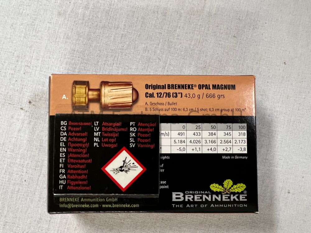 Du bist auf der Suche nach einer beeindruckenden Flintenpatrone, die keine Konkurrenz weltweit hat? Dann ist die OpalMagnum im Kaliber 12/76 genau das Richtige für dich! Mit einem schweren Projektil von 43,0 g (666 grs/1 ½ oz) beeindruckt sie mit außergewöhnlichen Energiewerten. Mit einer V0 von 491 m/s erzeugt sie unglaubliche 5.184 Joule, selbst auf eine Entfernung von 100 m sind es noch 2.173 Joule!