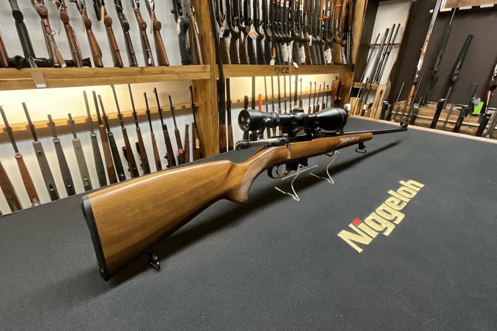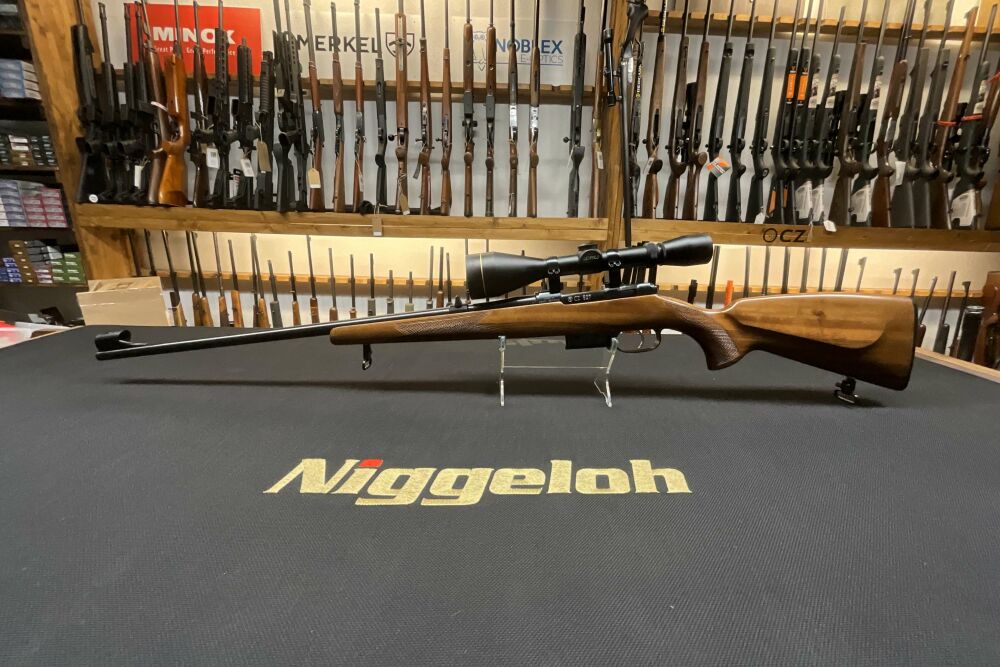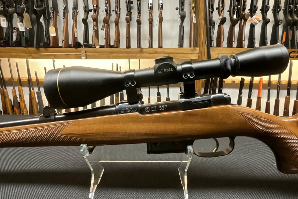 Gebrauchtwaffe CZ 527 in .22 Hornet, mit Direktabzug, fünf Schuss Magazin, abnehmbaren Riemenbügeln, sowie bereits montiertem Leupold Vari-X 3-9 × 50 mit 4C Absehen auf einer 14mm Prismenschiene.