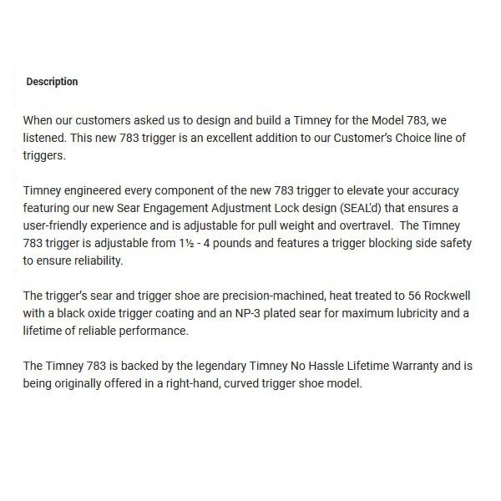 Rep.Büchse/Rifle Remington Modell 783, Drop-In Abzug mit Sicherung 3lbs/1.362gramm ab Werk eingestellt, verstellbar von 1,5lbs/681gramm bis 4lbs/1.816gramm, Code 783 Timney USA. Eine fachgerechte Montage wird empfohlen!