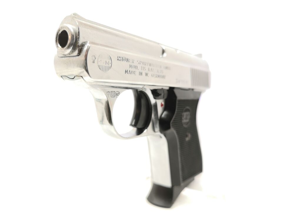 N3932 Rhöner - 115 - Note 1 - perfekte Taschenpistole für Sammler, Hersteller: Rhöner, Mod. 115, bicolor (silber/schwarz), tadelloser Sammlerzustand, Note 1, technisch und optisch perfekt, Sicherung links, Steckmagazin, ideal für Sammler, Händler und Exporteure *** voreintragspflichtig *** *** EWB-pflichtig ***