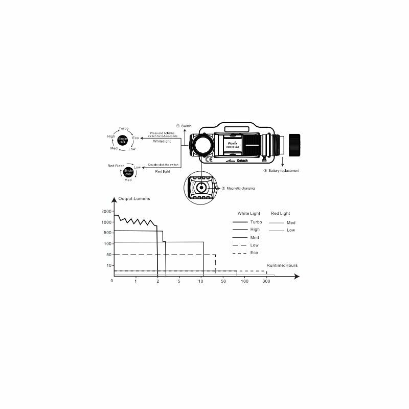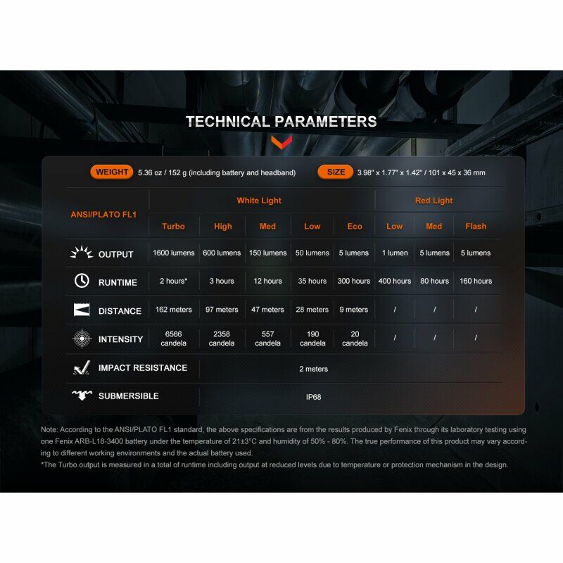 Hinweis: Gemäß dem ANSI/PLATO FL1-Standard stammen die oben genannten Spezifikationen aus den Ergebnissen, die Fenix im Rahmen seiner Labortests mit einer Fenix ARB-L18-3400-Batterie bei einer Temperatur von 21 ± 3 °C und einer Luftfeuchtigkeit von 50 % bis 80 % erzielt hat %. Die tatsächliche Leistung dieses Produkts kann je nach Arbeitsumgebung und tatsächlich verwendetem Akku variieren.