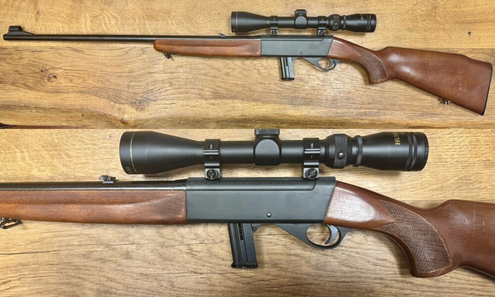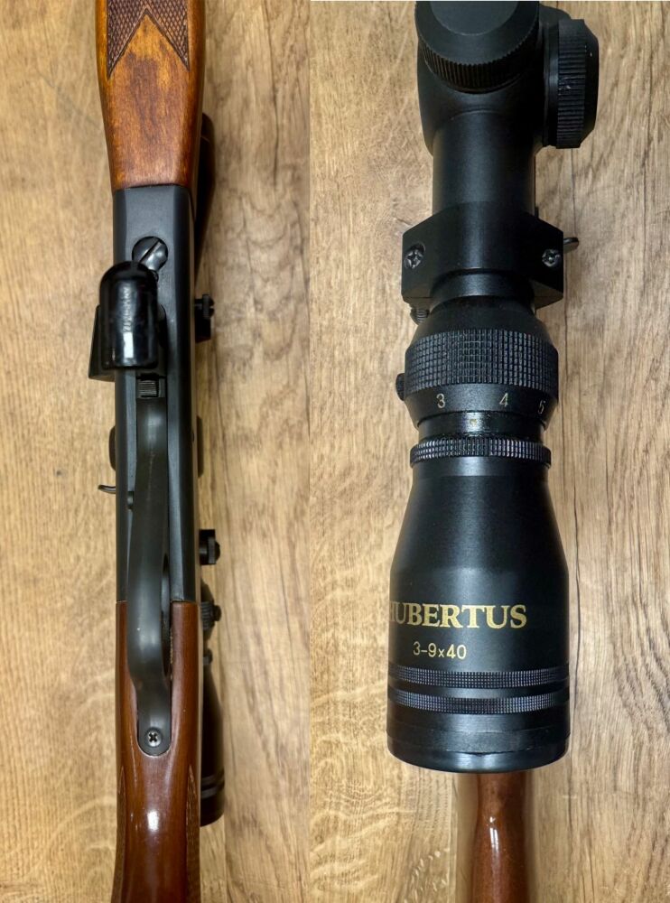 Auf dem Waffe ist per Festmontage ein Zielfernrohr Hubertus, 3-9x40, Abs. 1 montiert.