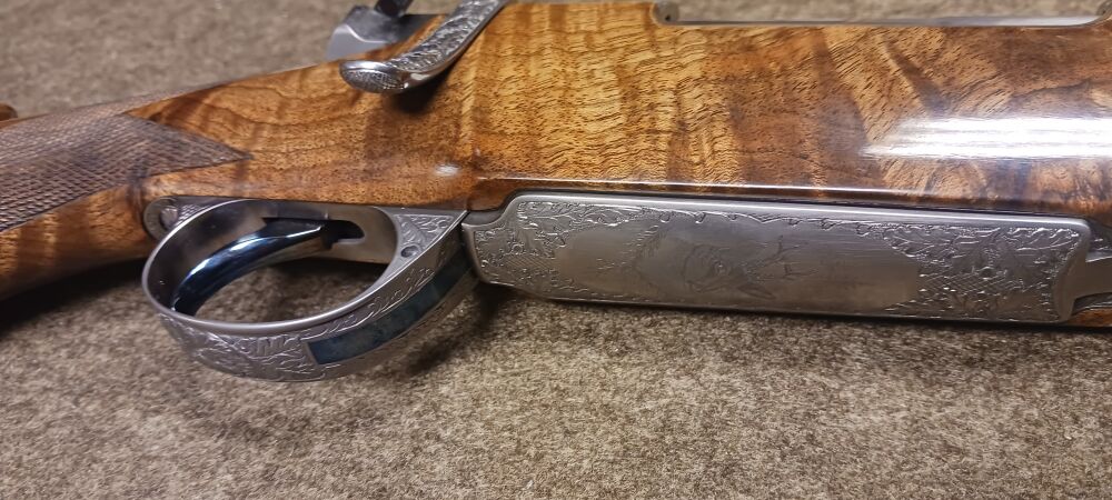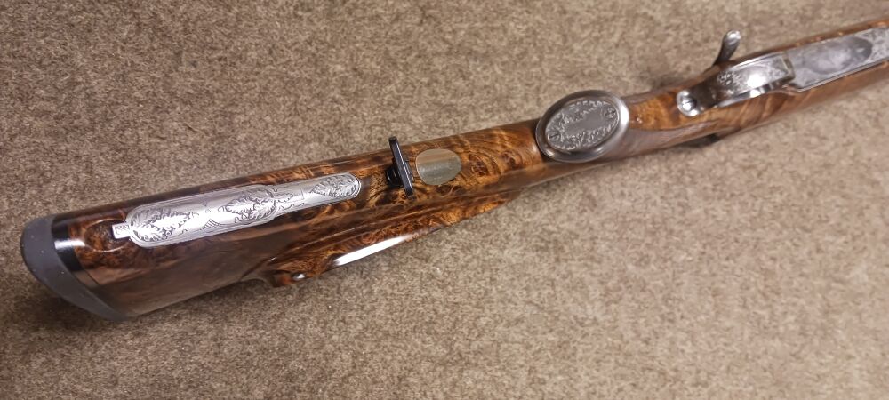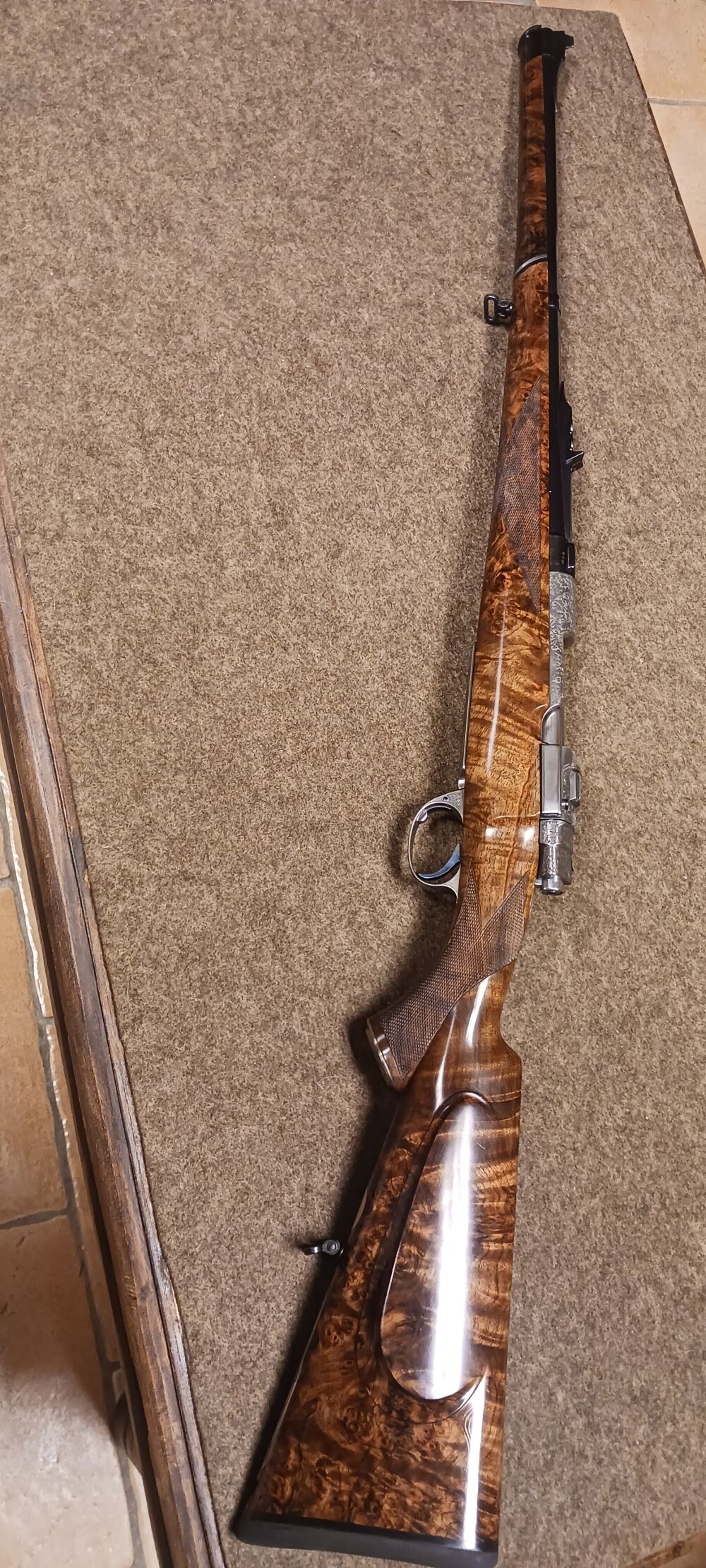 Repetierstutzen Mauser 98, modifiziertes Argentinosystem, Klappdeckelmagazin, gerundeter Flintenabzug, Securasicherung , Schaftmagazin, Schwenkmontage mit ZF Kahles HELIA 2-10x50 i, Abs 4 beleuchtet.... ...weiterlesen
