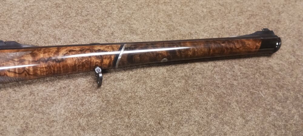 Schaftmagazin, Schwenkmontage mit ZF Kahles HELIA 2-10x50 i, Abs 4 beleuchtet.Vorderschaftholz aus dem Hinterschaft geschnitten. Trennung : Stahl / Horn. Gesamtläne 104 cm, Lauflänge 48,5 cm, Schaftlänge 35 cm, gemessen vom weit zurückliegenden Abzug. Der Schaft weist geringste Spuren auf - Die Büchse wurde jagdlich nicht geführt, lediglich auf dem Stand geschossen