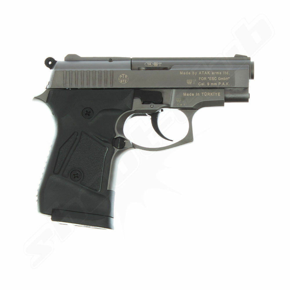 Diese moderne, kompakte Schreckschusspistole verfügt über einen ergonomisch geformtes Griffstück, stahlverstärkten Funktionsteilen und Single/ Double-Action Abzug. nNoch vor wenigen Jahren war die Firma ATAK Arms aus der Türkei hier in Deutschland gänzlich unbekannt. Zulassungsbedingt war daher die Zoraki 914-P unseren Nachbarländern vorbehalten. Dies änderte sich aber 2011, als die Firma ESC den Import übernahm und für eine PTB Zulassung sorgte. Die anfängliche Skepsis gegenüber einer türkischen Schreckschuss Pistole verflog, als erste Erfahrungsberichte in Umlauf kamen. Diese stellten die Qualität auf eine Stufe mit Herstellern Umarex & Co. In Sachen Zuverlässigkeit zieht sie sogar an so manchem deutschen Konkurrenten vorbei. Bei der Zoraki 914-P handelt es sich um eine kompakte halbautomatische Gaspistole mit einer Magazinkapazität von 14 Schuss im Kaliber 9mm P.A.K.. Bei der Titan Farbvariante werden schwarze Kunststoffgriffschalen verbaut. Die 914-P verfügt des Weiteren über eine manuelle Flügelsicherung sowie einen kombinierten Single-/Double Action Abzug.