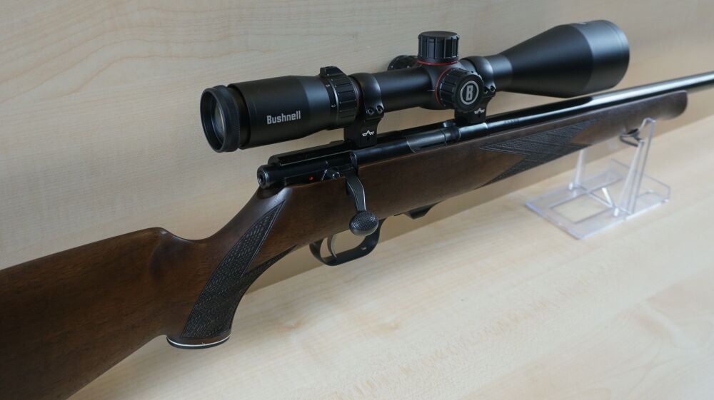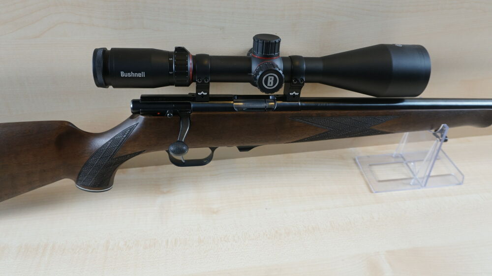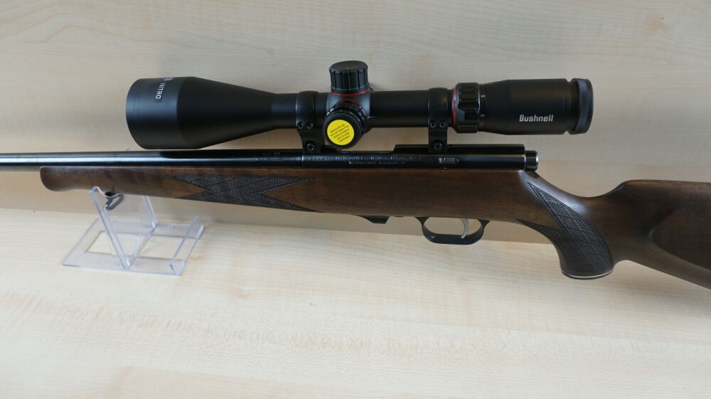 Repetierbüchse Weihrauch, Modell HW 66 Classic Hunter, im Kaliber 17 Hornet mit Nußbaumschaft mit Backe, 51 cm Lauflänge mit Mündungsgewinde, 600 Gramm Abzug, Riemenbügelhalter, 4 Schuß Magazin, EAW Montage, Zielfernrohr  Bushnell, Nitro 3 - 18 x 56 Leuchtabsehen 4.