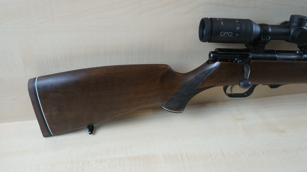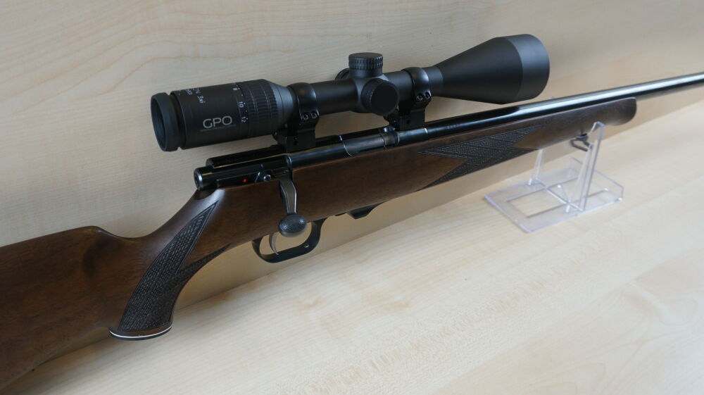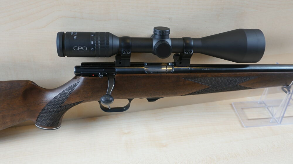 Repetierbüchse Weihrauch, Modell HW 66 Classic Hunter  im Kaliber 17 Hornet mit Nußbaumschaft mit Backe, 51 cm Lauflänge mit Mündungsgewinde, 600 Gramm Abzug, Riemenbügelhalter, 4 Schuß Magazin, Recknagel Montage, Zielfernrohr GPO, Passion 3x,  4 - 12 x 50 Leuchtabsehen 4.