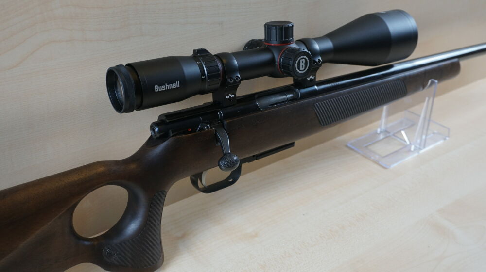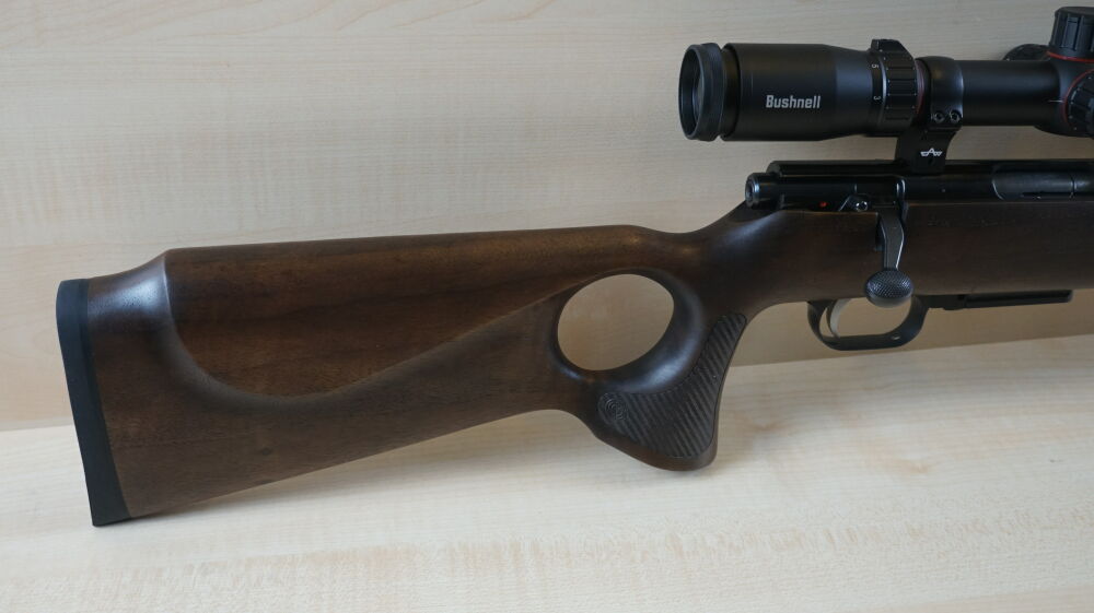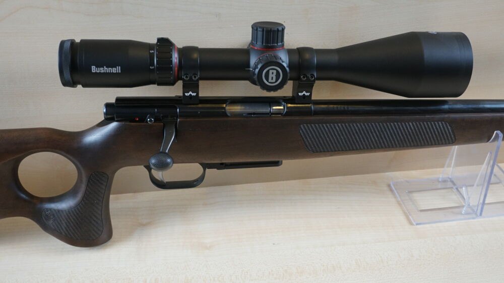 Repetierbüchse Weihrauch, Modell HW 66 Thumbhole im Kaliber 17 Hornet mit Nußbaum Lochschaft, Lauflänge 51 cm mit Mündungsgewinde, 600 Gramm Abzug, Riemenbügelhalter, 4 Schuß Magazin, EAW Montage, Zielfernrohr Bushnell, Nitro 3 - 18 x 56 Leuchtabsehen 4.