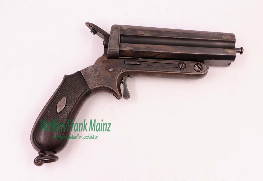 Baujahr: um 1880, Zustand: 3-4, Lauflänge: 10,5cm, Gesamtlänge: 18cm,vor längerer Zeit fachlich überarbeitet, jedoch Beschriftung und Bestempelung noch gut lesbar, 4-schüssiges, gezogenes Laufbündel m... ...weiterlesen