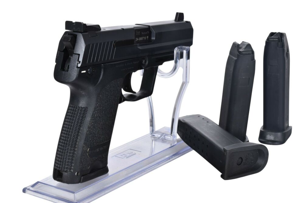 Diese Heckler & Koch Modell USP im Kaliber 9mm Luger Selbstladepistole wird im Koffer geliefert und verfügt über vier Magazine. Die Pistole befindet sich im Zustand 2, was auf normale Gebrauchsspuren hindeutet. Dazu zählen leichte bis mittelstarke Gebrauchsspuren sowie mögliche leichte Kratzer an der Oberfläche bei normaler Schussbelastung. Diese Zustandsbewertung gilt als generelle Einschätzung, es müssen nicht alle beschriebenen Merkmale zwingend vorhanden sein.