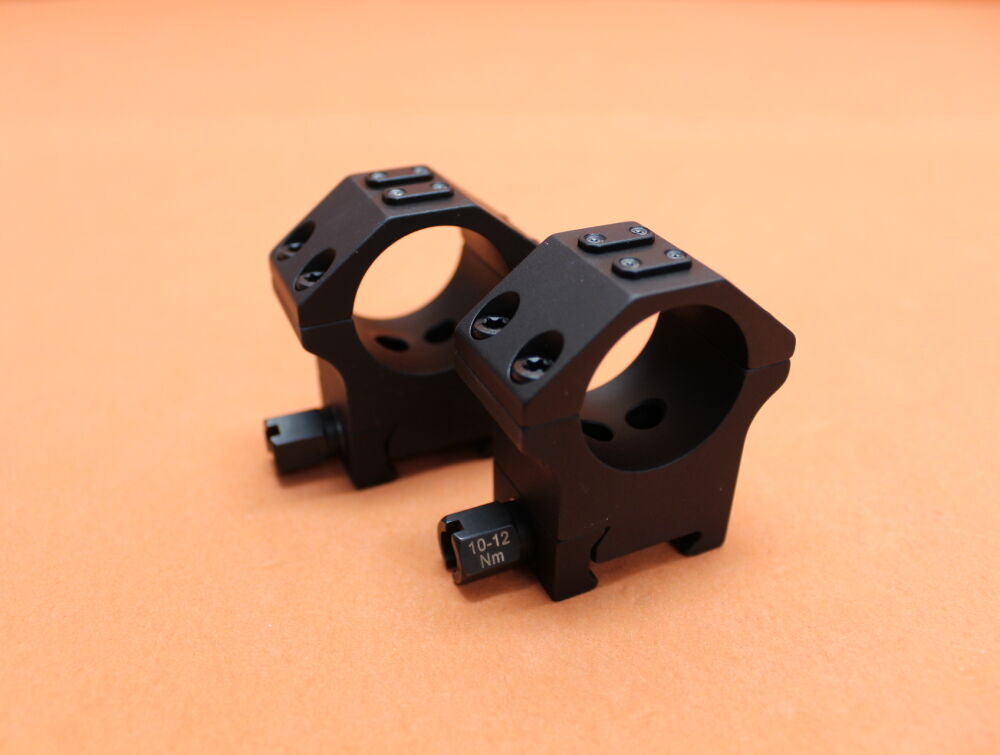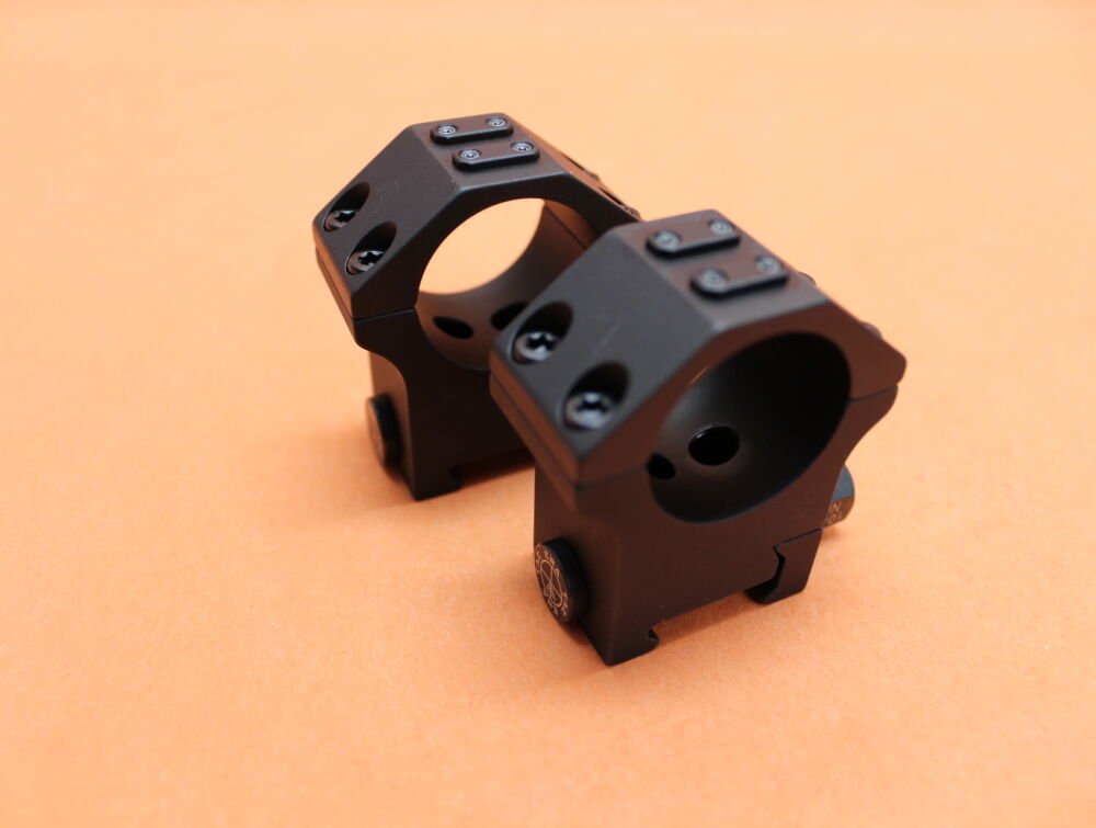 Zweiteilige Ringmontagen aus hochfestem Aluminium und harteloxiert nach Mil-Spec. Typ III Mattschwarz. Sie sind verfügbar als schnell abnehmbare Version mit Sicherheitshebeln oder aber mit Sechskantmuttern; erstere machen den Einsatz von Werkzeugen überflüssig. Durch ihre Einstellbarkeit lassen sich die Hebel problemlos auf außerhalb der Norm liegende Picatinny-Schienen einstellen. Die Sicherheitshebel werden aus Stahl hergestellt und sind rostfrei und gehärtet. Jeder 25 mm breite Ring ist mit unserer UNIVERSAL-Schnittstelle ausgestattet. Lieferbar mit Ringen im Durchmesser 30 mm und 34 mm in diversen Bauhöhen. Der Durchmesser 1“ wird durch Reduzierringe erreicht.